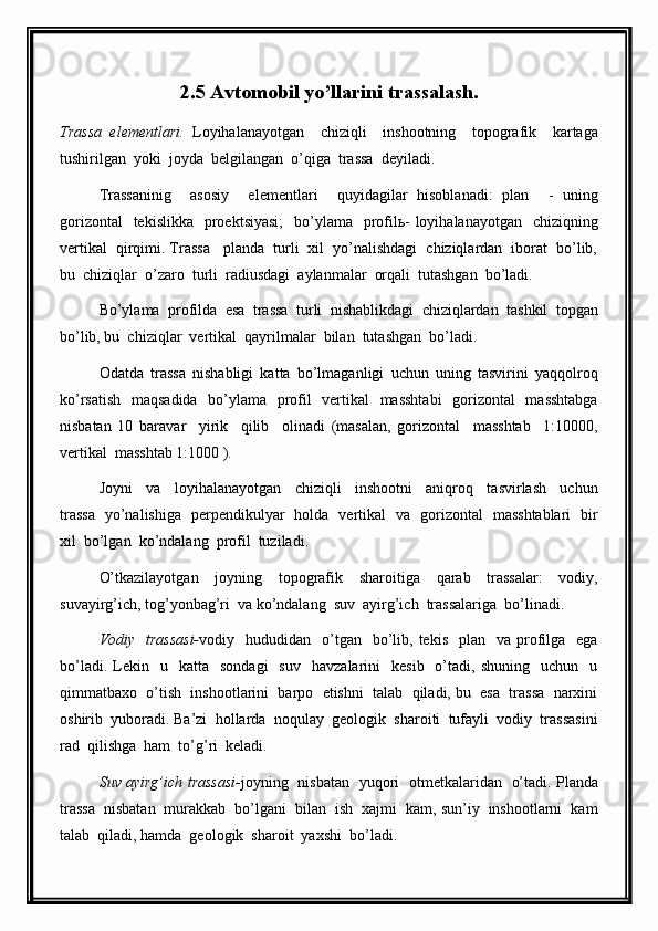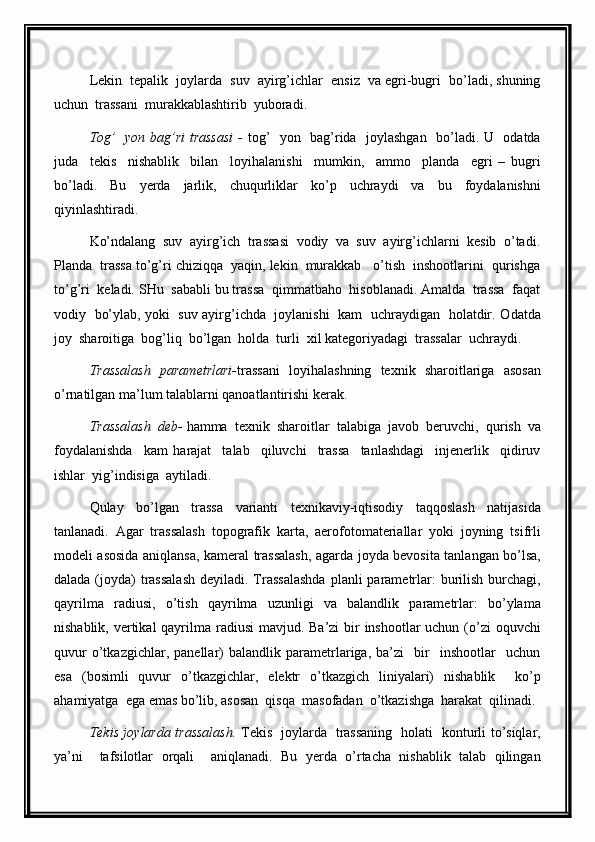 SHuning     uchun,     tog’li     joylarda     trassa     plani     murakkab     ko’rinishga     ega.