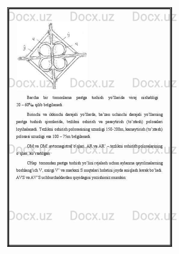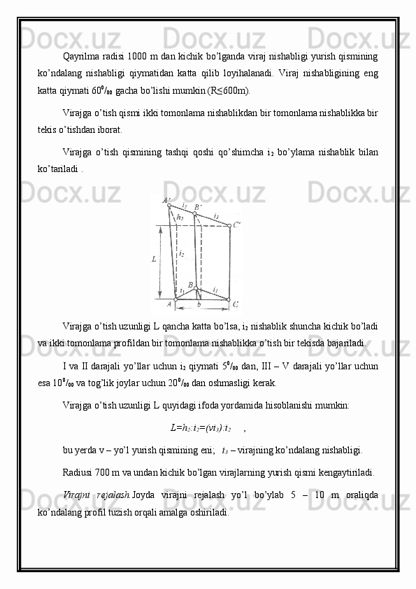 qayrilmasining   radiusi   30-25   m,   virajning   ko’ndalang   nishabligi   60 0