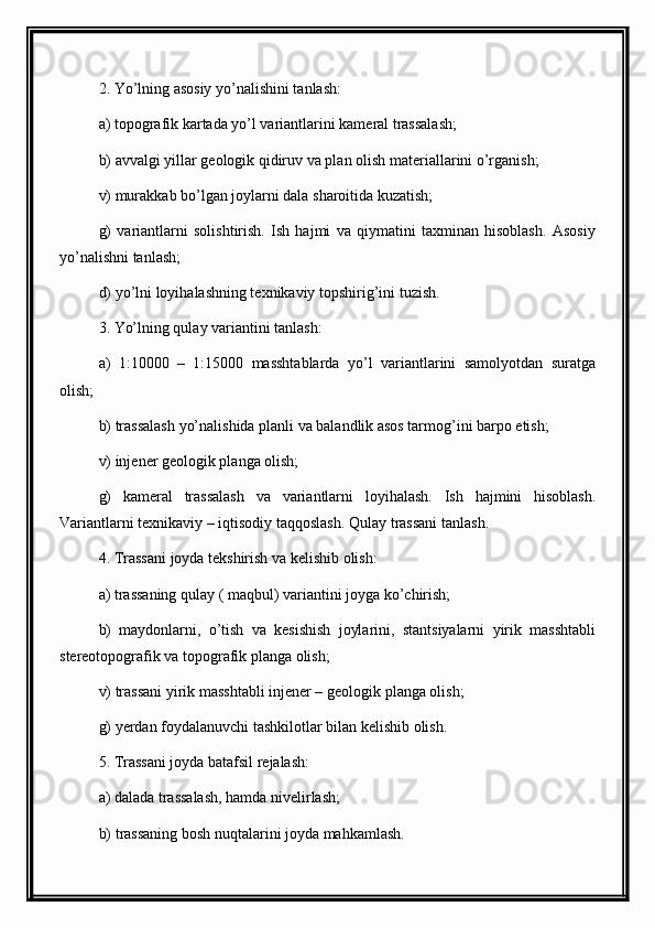 a) yirik masshtabli kartada yo’lning iqtisodiy samarador variantini aniqlash ;