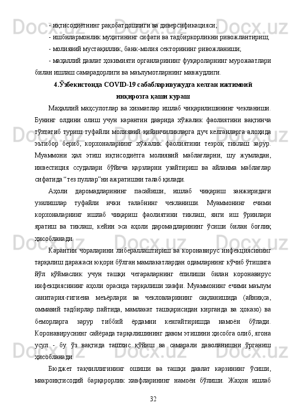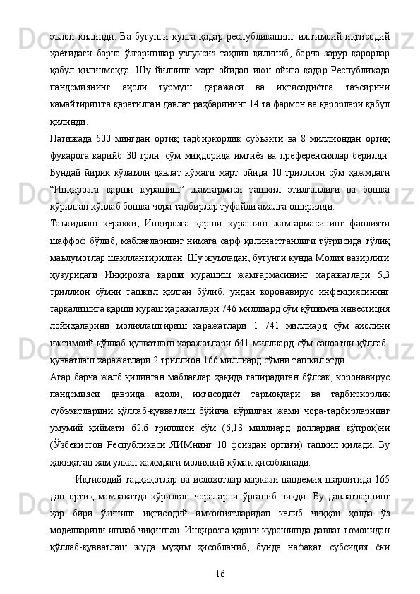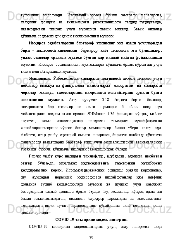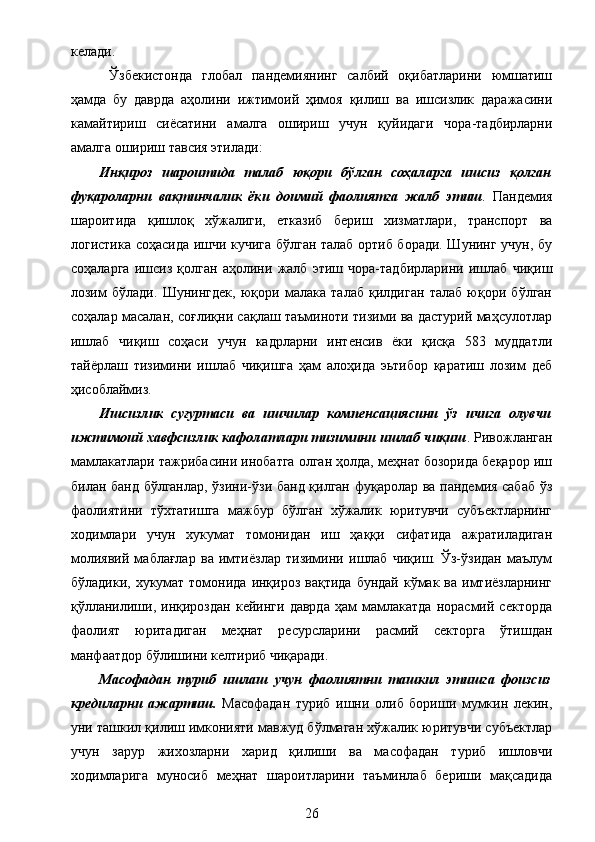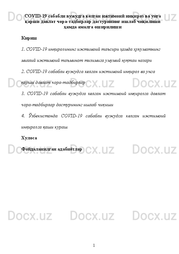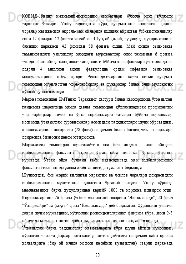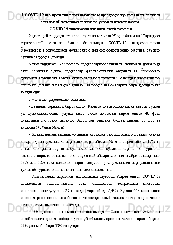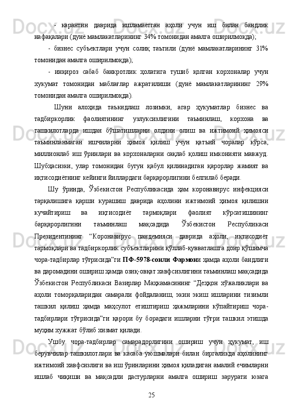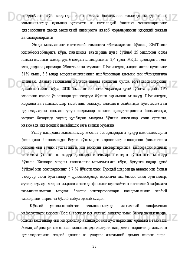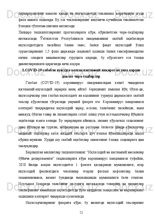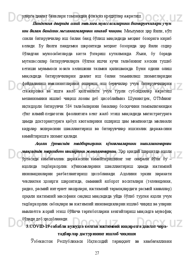COVID-19 сабабли вужудга келган ижтимоий инқироз ва унга қарши давлат чора-тадбирлар дастурининг ишлаб чиқилиши ҳамда амалга оширилиши