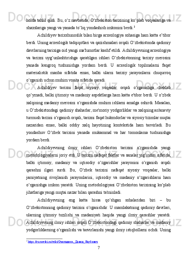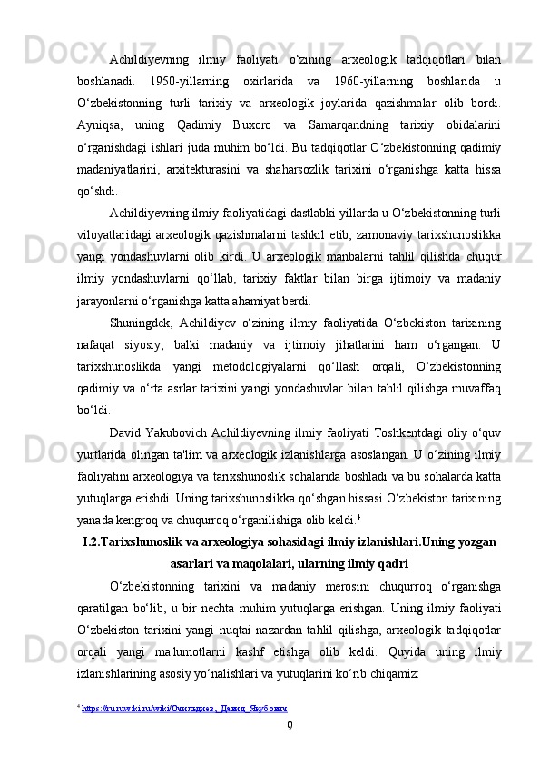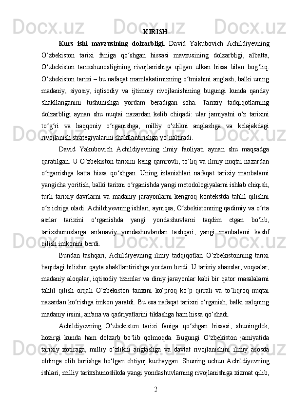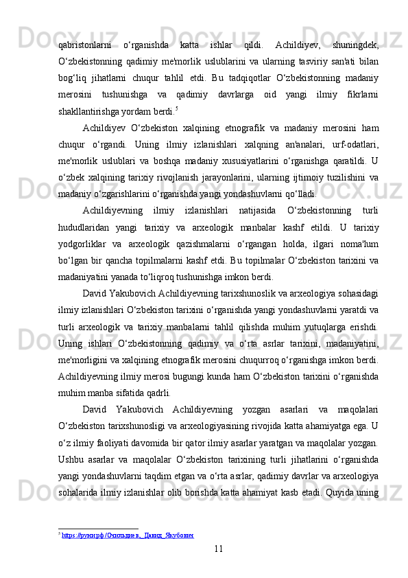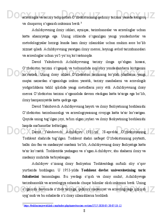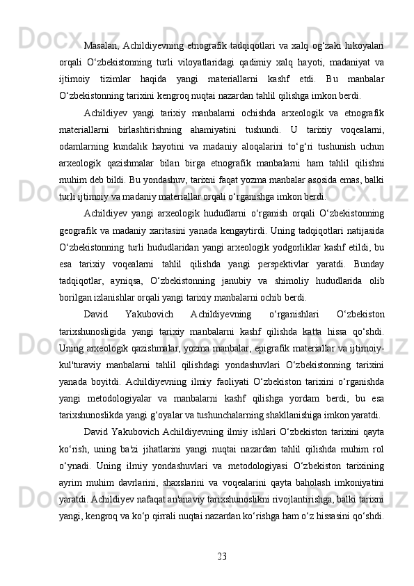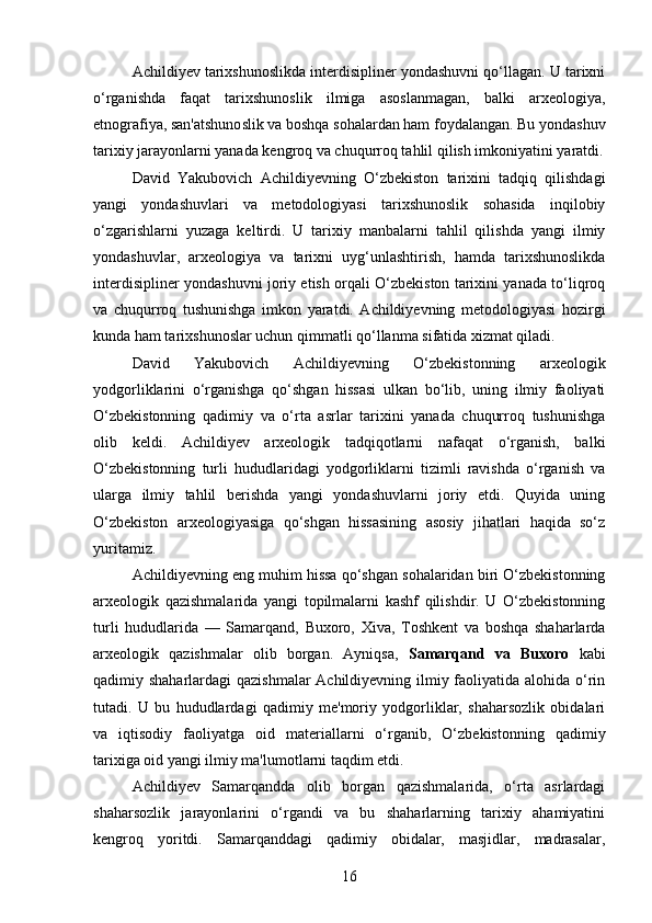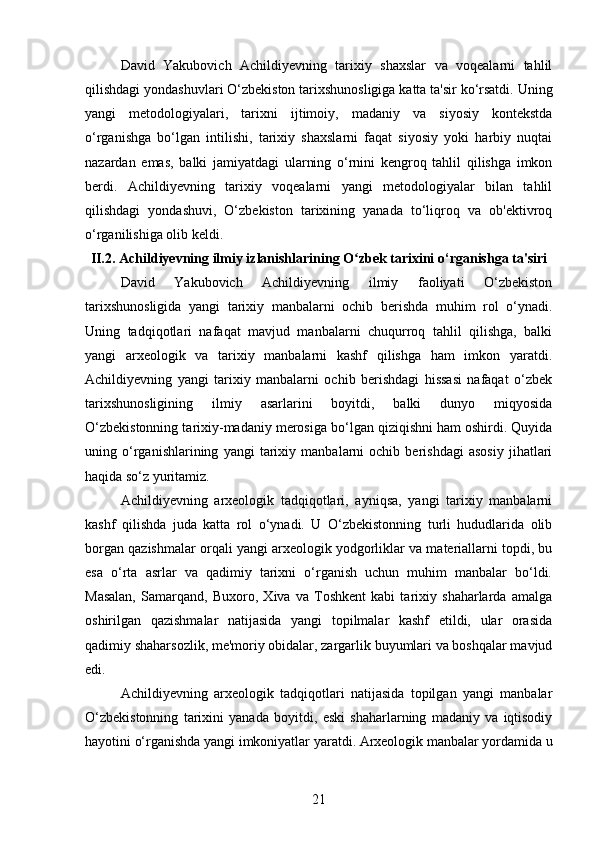 DAVID YAKUBOVICH ACHILDIYEVNING OʻZBEKISTON TARIXI FANIGA QOʻSHGAN HISSASI