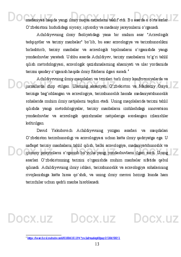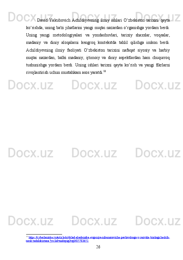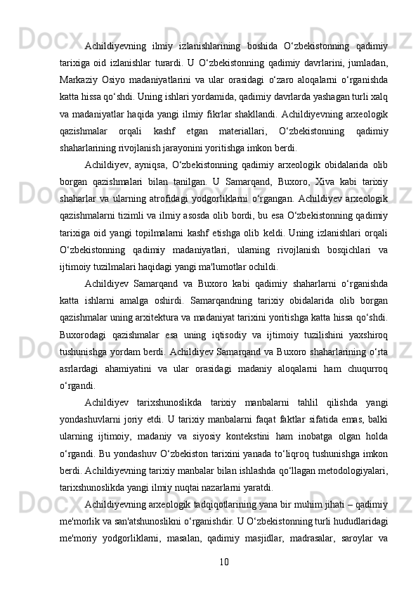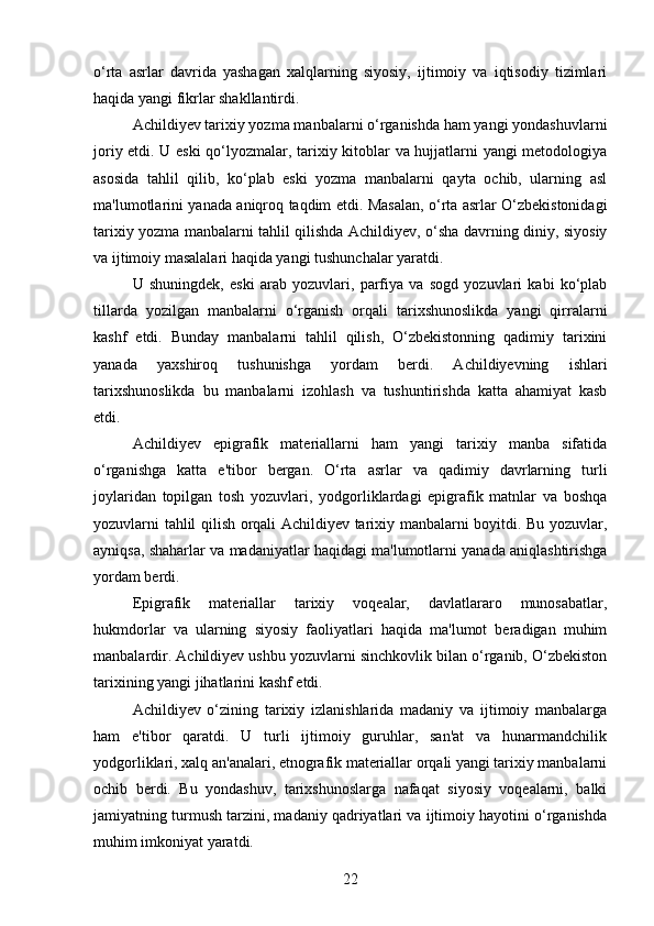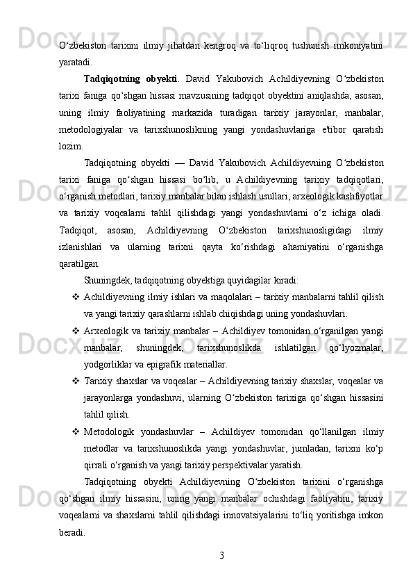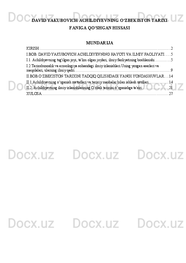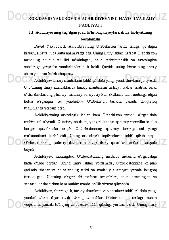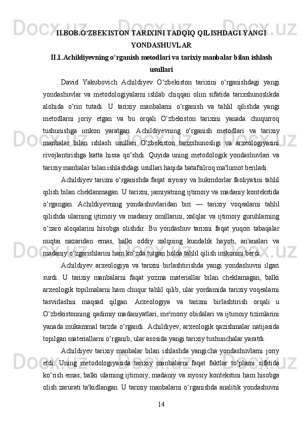 DAVID YAKUBOVICH ACHILDIYEVNING OʻZBEKISTON TARIXI FANIGA QOʻSHGAN HISSASI