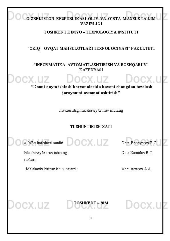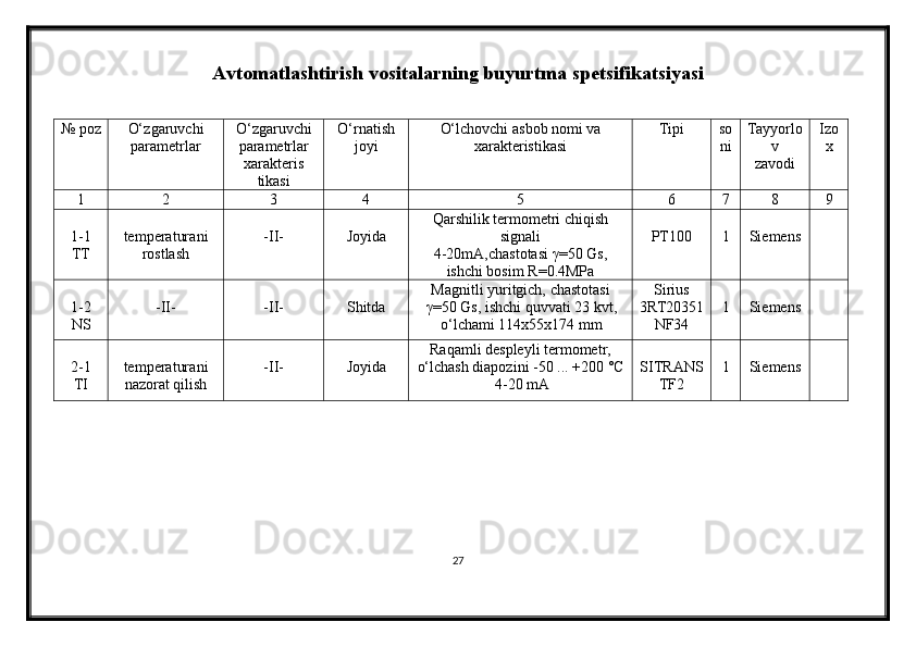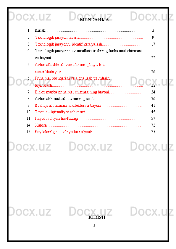 | 5 | Avtomatlashtirish vositalarining buyurtma spetsifikatsiyasi.............................................................................. |
