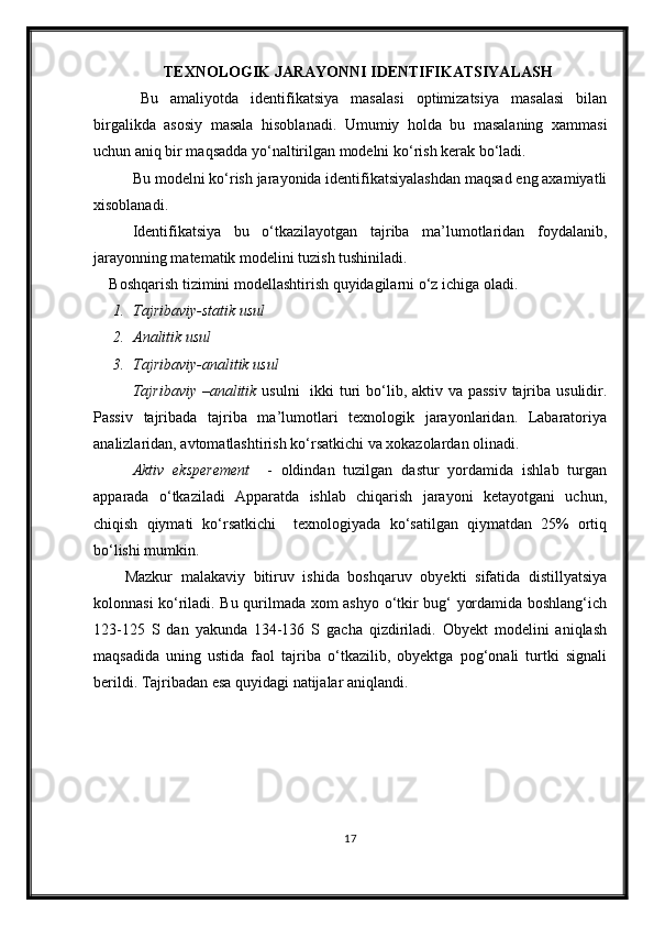 | 3 | Texnologik jarayonni identifikatsiyalash........................................ | 17 |