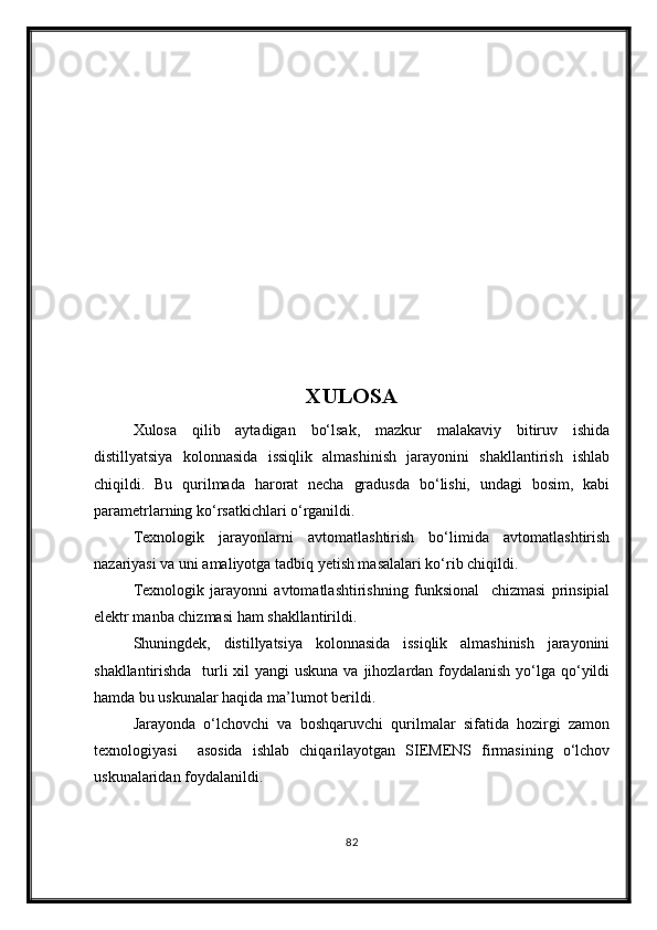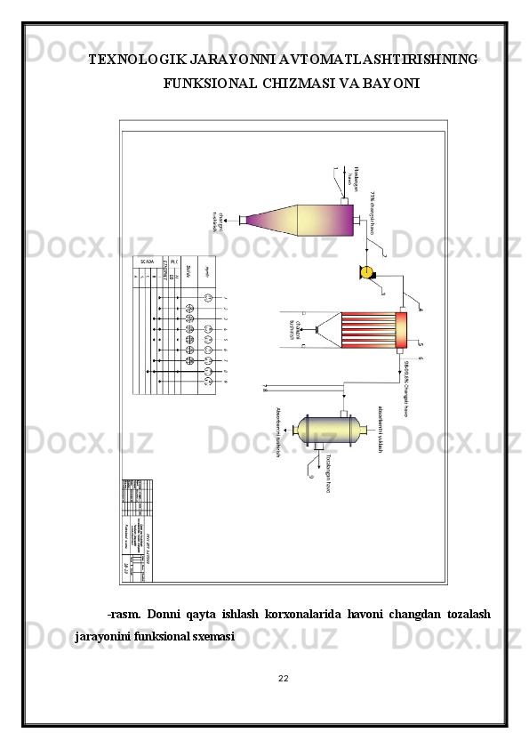 | 4 | Texnologik jarayonni avtomatlashtirishning funksional chizmasi va bayoni......................................................................................... |