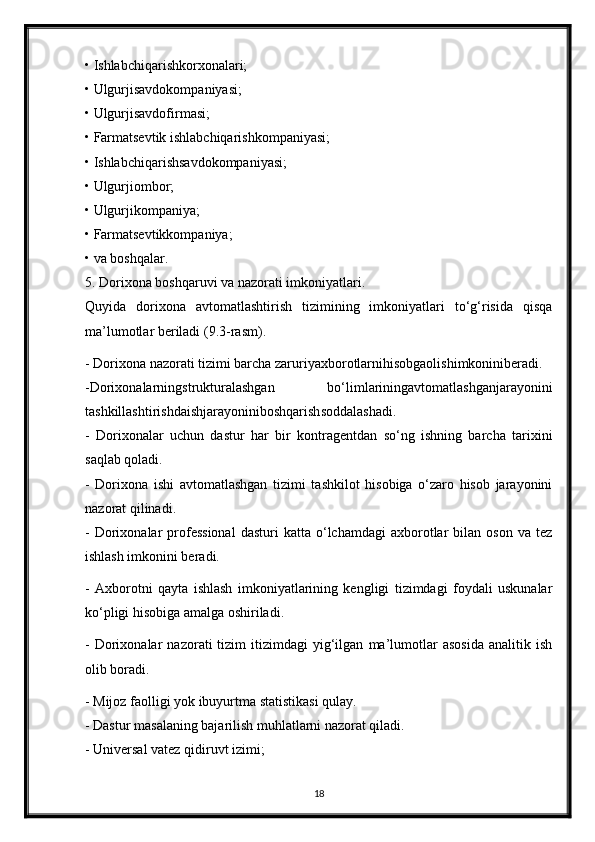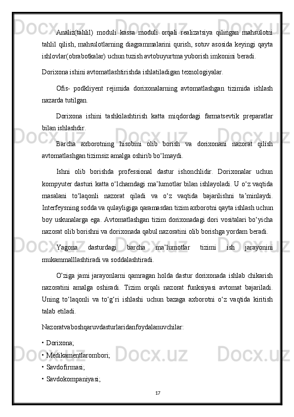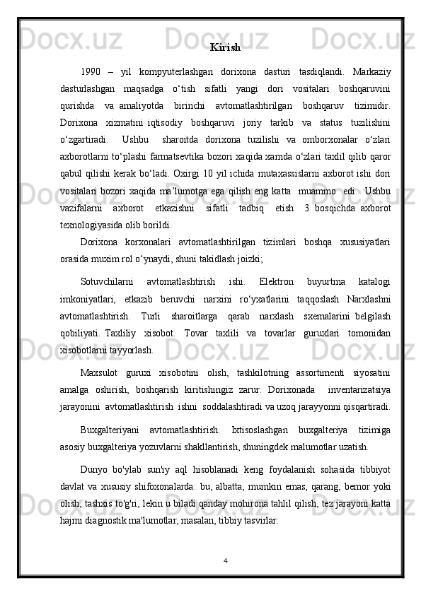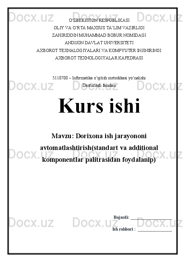 Dorixona ish jarayononi avtomatlashtirish (standart va additional komponentlar palitrasidan foydalanib)