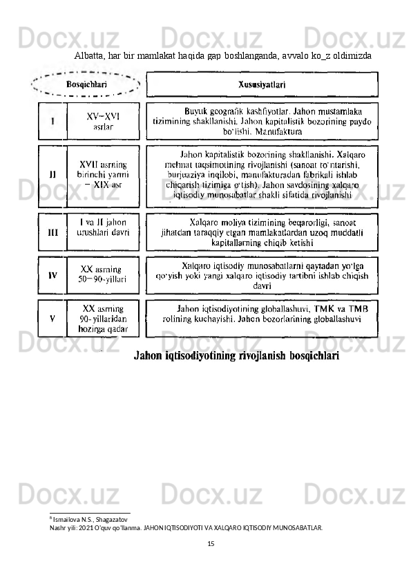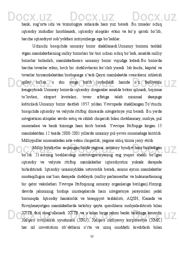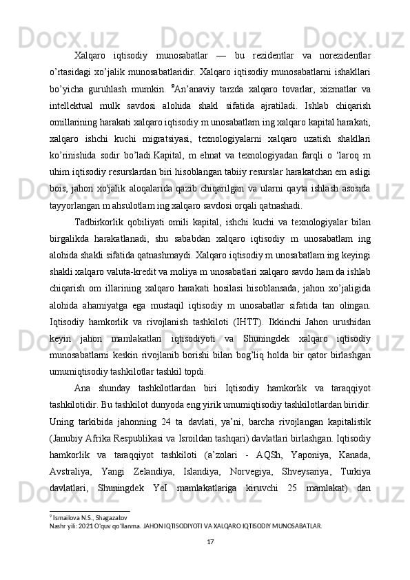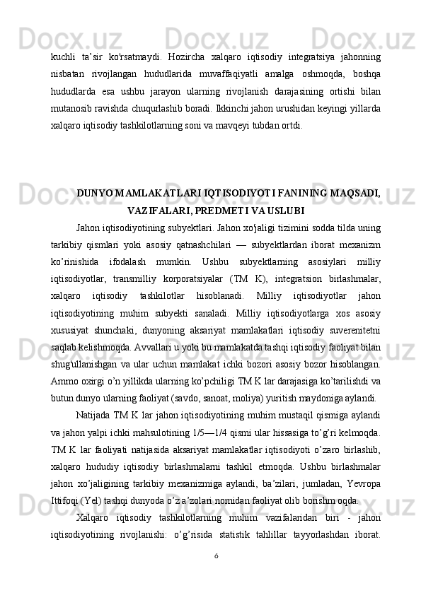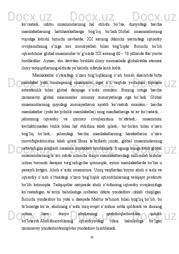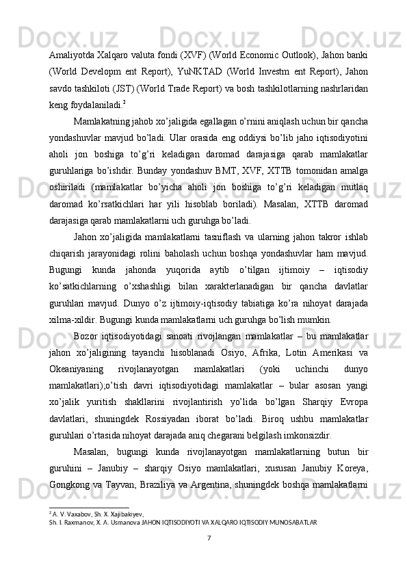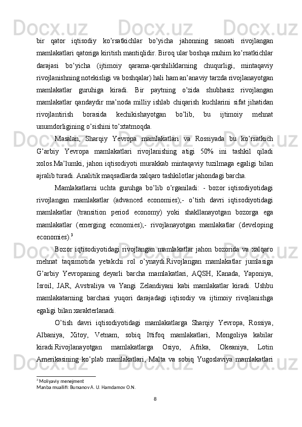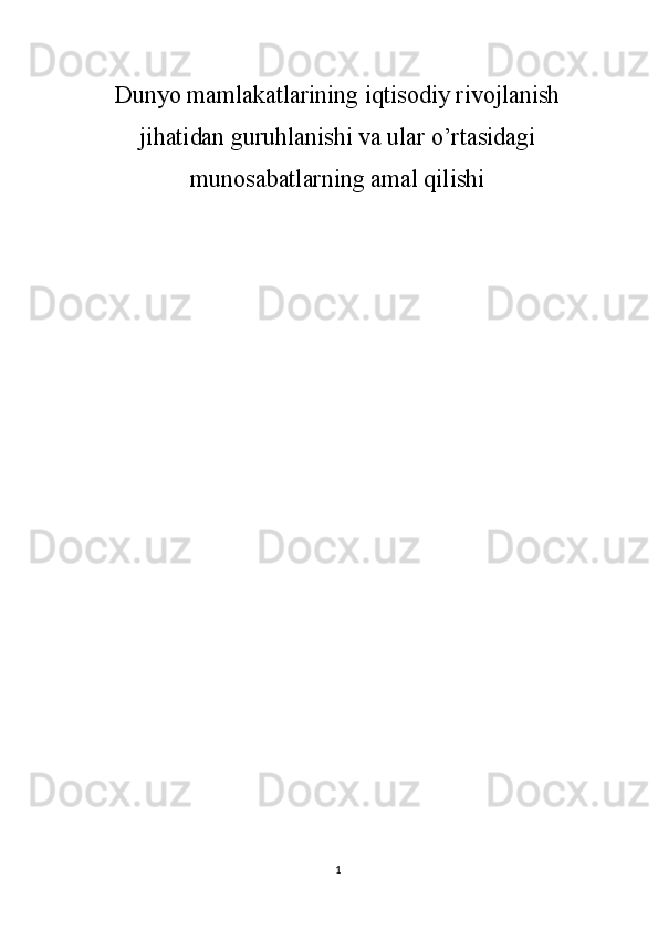 Dunyo mamlakatlarining iqtisodiy rivojlanish jihatidan guruhlanishi va ular o’rtasidagi munosabatlarning amal qilishi