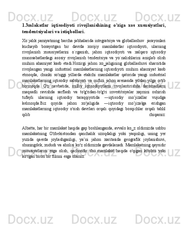 1.2. Dunyo mamlakatlar iqtisodiyoti rivojlanishining o’ziga xos xususiyatlari,