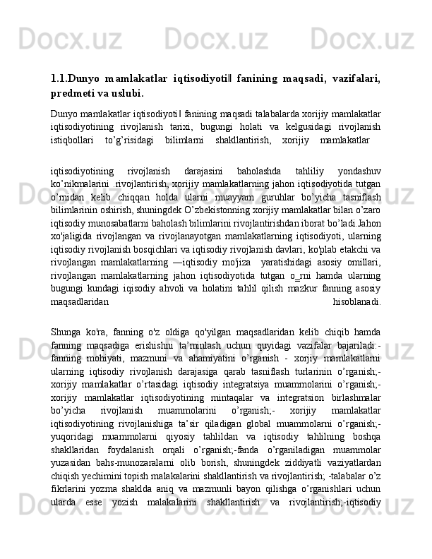 1 .1. Dunyo mamlakatlar iqtisodiyoti  fanining maqsadi, vazifalari, predmeti va ‖
