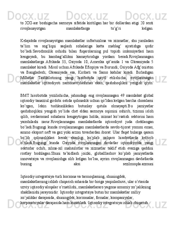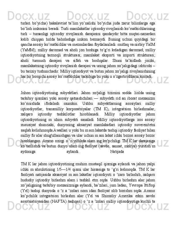 bo’lish imkonini beradi. Turli mamlakatlar iqtisodiy rivojlanish ko’rsatkichlarining