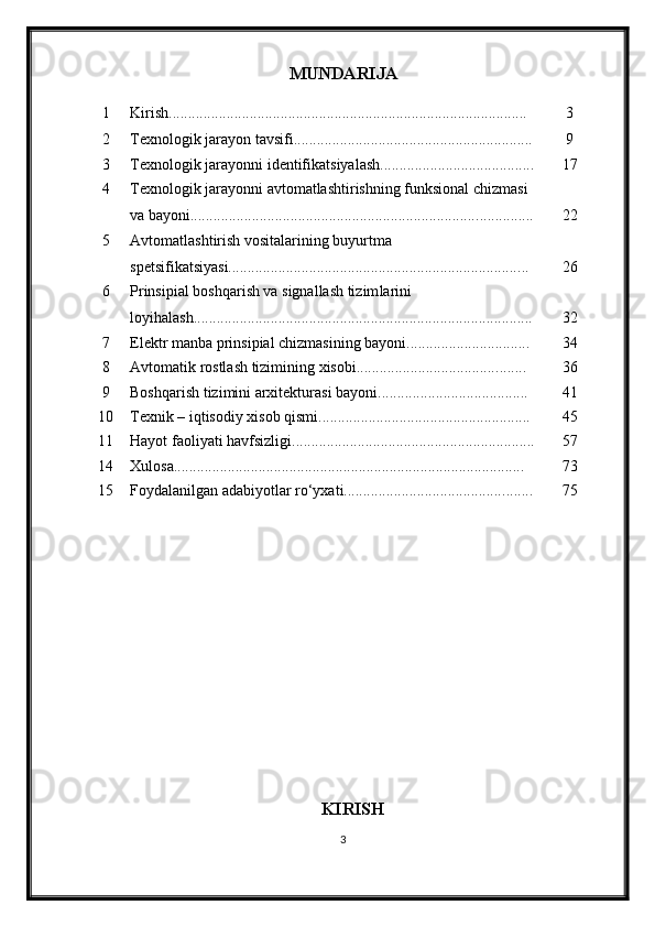 | 5 | Avtomatlashtirish vositalarining buyurtma spetsifikatsiyasi.............................................................................. |