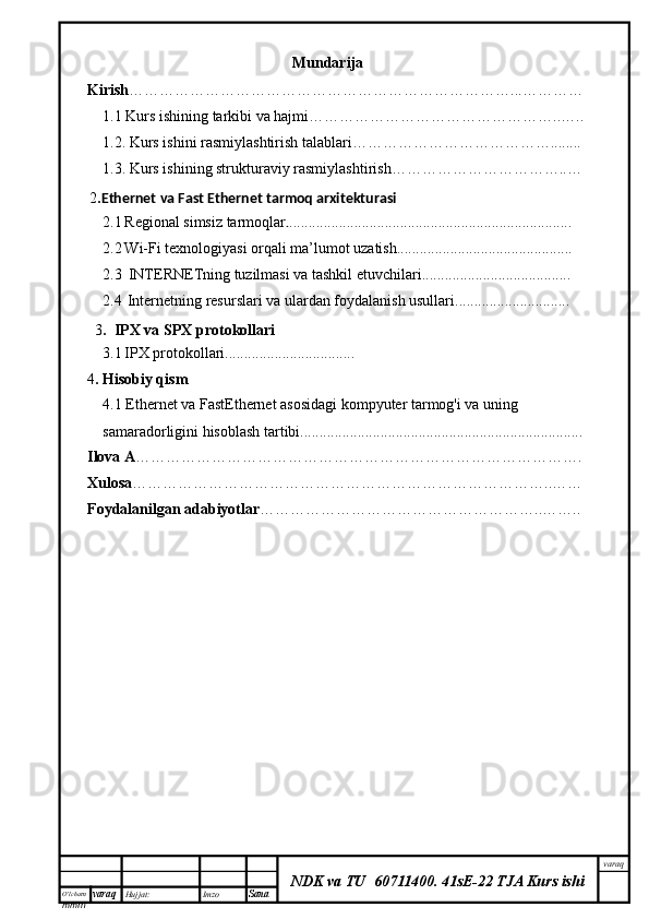 | 1.1 Kurs ishining tarkibi va hajmi…………………………………………..….. |