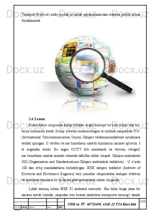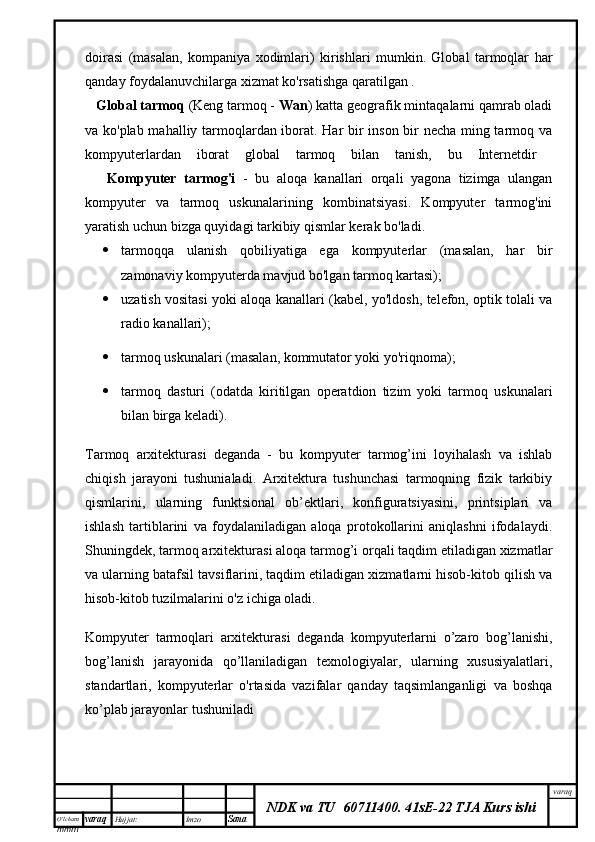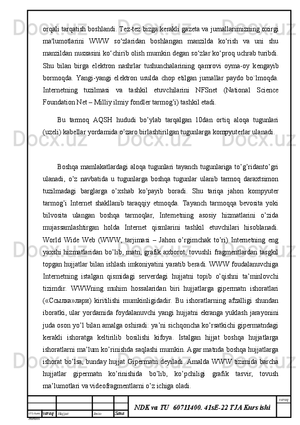 | 2.3 INTERNETning tuzilmasi va tashkil etuvchilari....................................... |