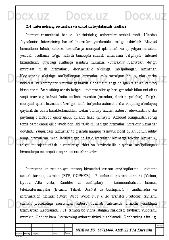 | 2.4 Internetning resurslari va ulardan foydalanish usullari.............................. |