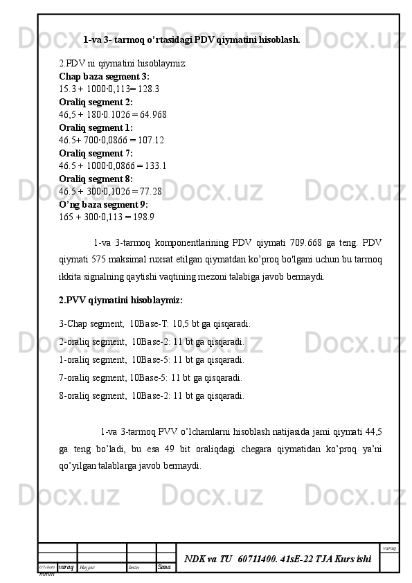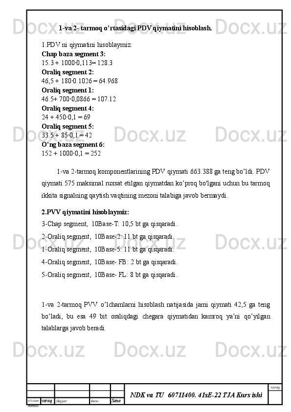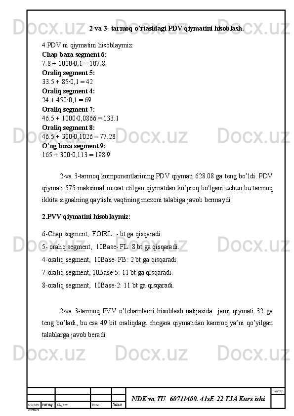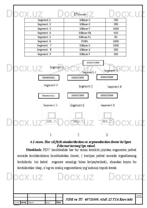 | 4.1 Ethernet va FastEthernet asosidagi kompyuter tarmog'i va uning samaradorligini hisoblash tartibi.......................................................................... |