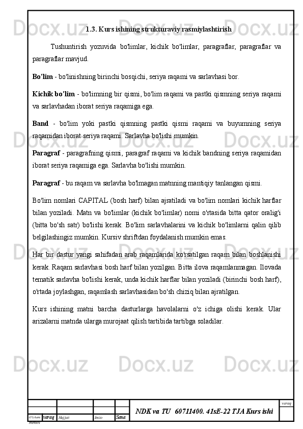 | 1.3. Kurs ishining strukturaviy rasmiylashtirish……………………………..… |