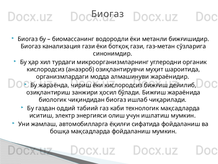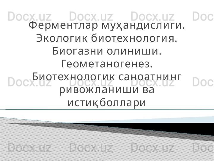 Ферментлар муҳандислиги. Экологик биотехнология. Биогазни олиниши. Геометаногенез
