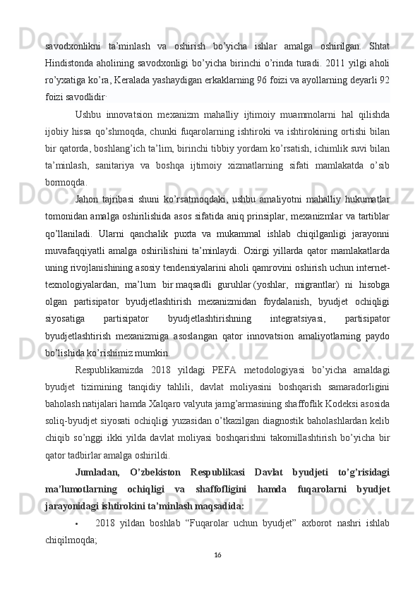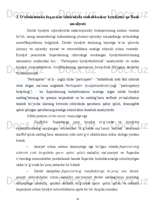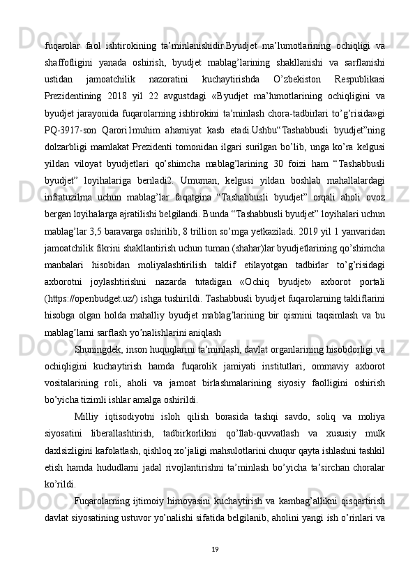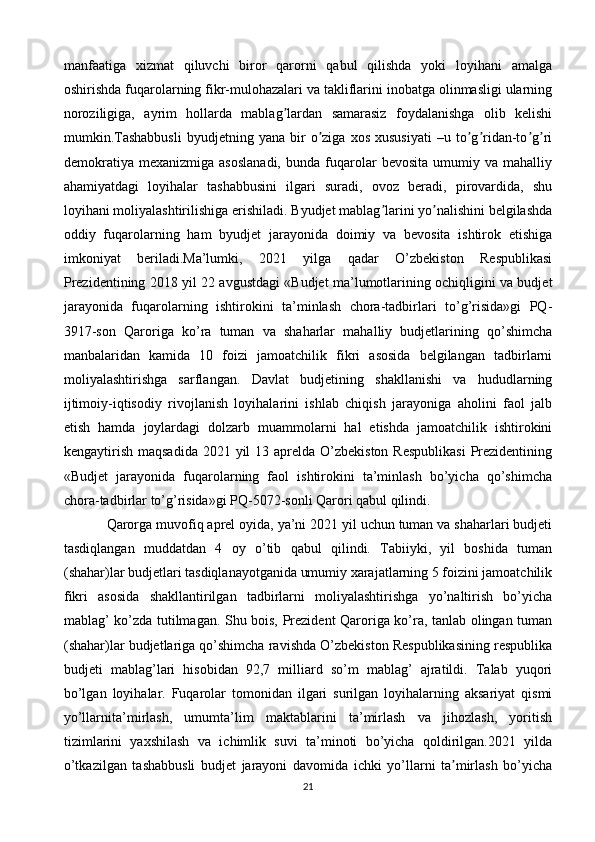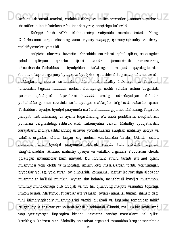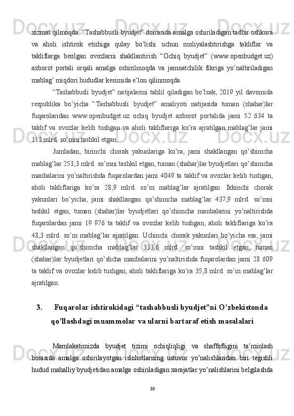 Fuqarolar ishtirokida tashabbuskor byudjet va uni O’zbekistonda qo’llash amaliyoti - muammo va yechimlar