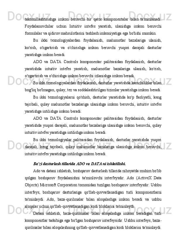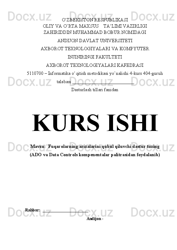 Fuqarolarning arizalarini qubul qiluvchi dastur tuzing (ADO va Data Controls kompenentalar palitrasidan foydalanib)