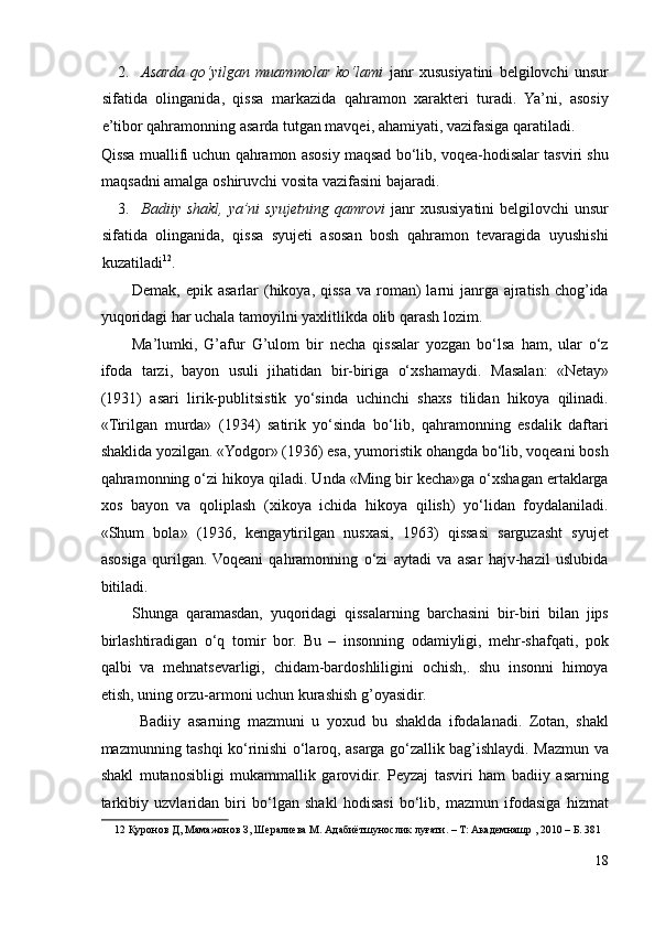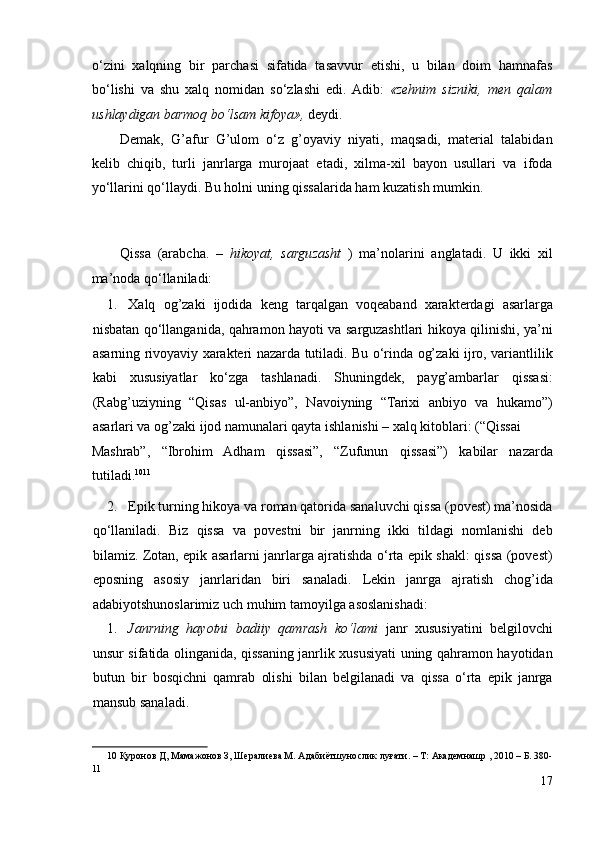 I.2. Yozuvchi nasriy merosining janriy rang-barangligi va ichki rivoji.........13