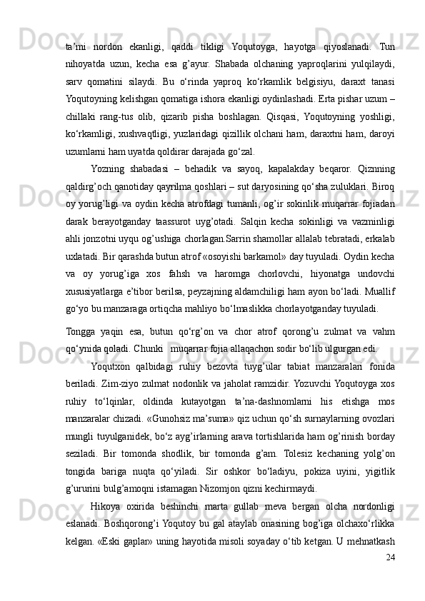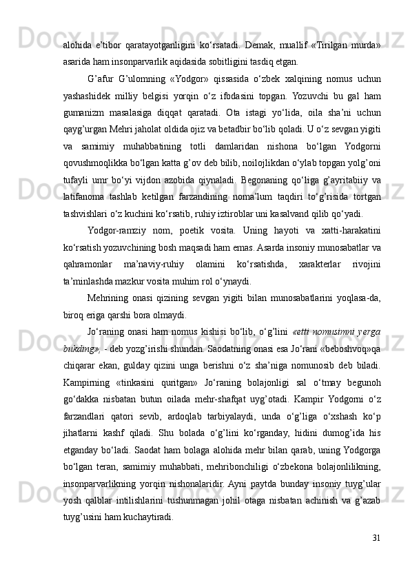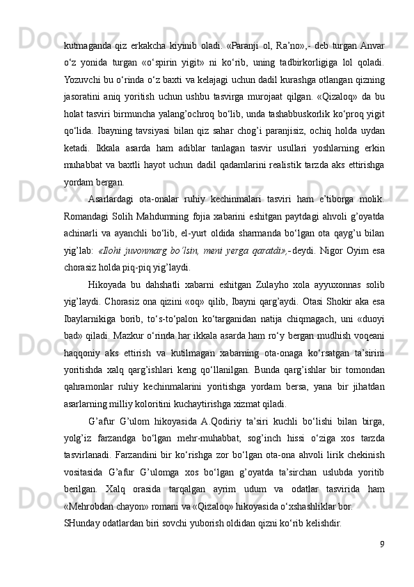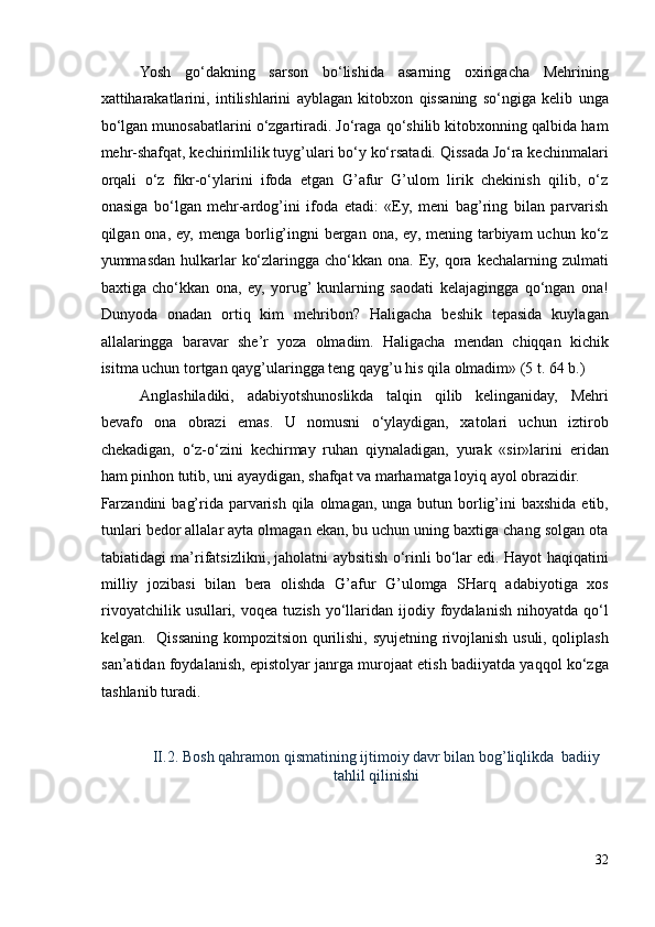 II.2. Bosh qahramon qismatining ijtimoiy davr bilan bog’liqlikda badiiy tahlil qilinishi ………………………………………………………………………..33