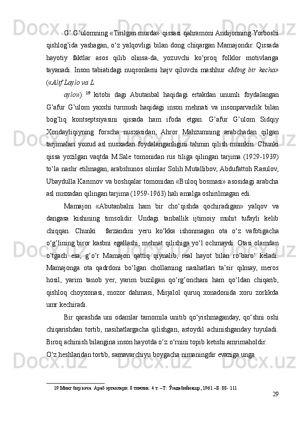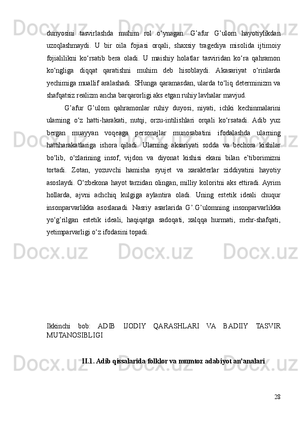 II.1. Adib qissalarida folklor va mumtoz adabiyot an’analari………………29