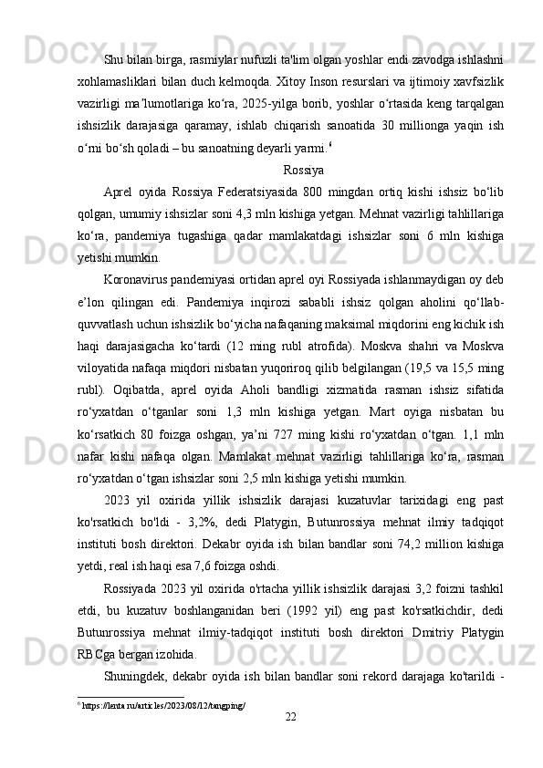 oshmoqda.   Mart   oyida   bu   ko‘rsatkich   2,5   foizga   teng   edi,   umumiy   ishsizlar   soni
