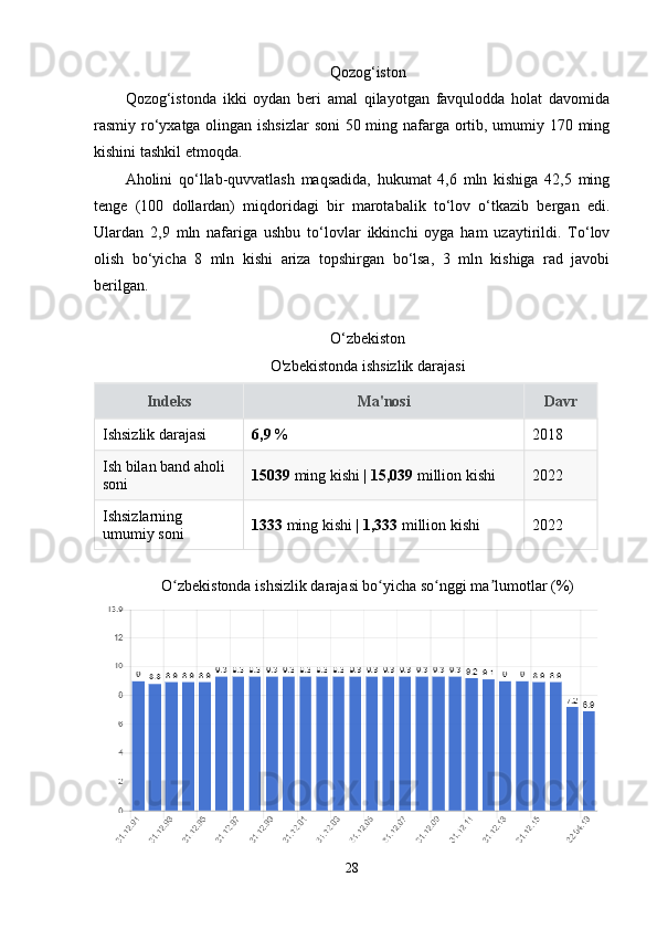 Ma’lumotlarga   ko‘ra,   Mart   oyida   8,7   foizga   teng   bo‘lgan   ishsizlik