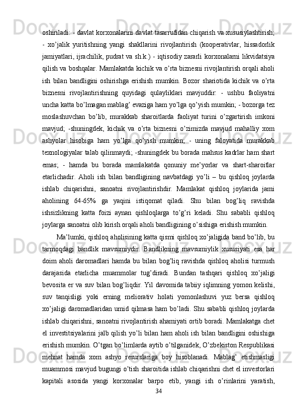 qilish va boshqalar. Mamlakatda kichik va o’rta biznеsni rivojlantirish orqali aholi