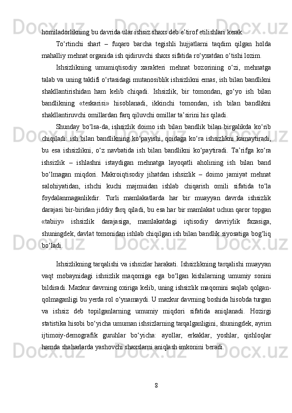 jarayondir. U mehnat  bozorida ishchi  kuchining nisbatan katta taklifi bilan ishchi