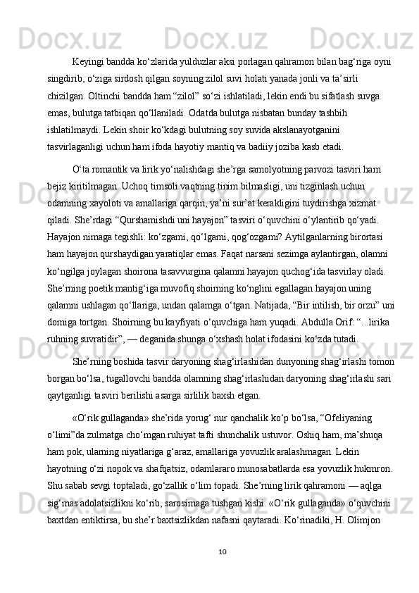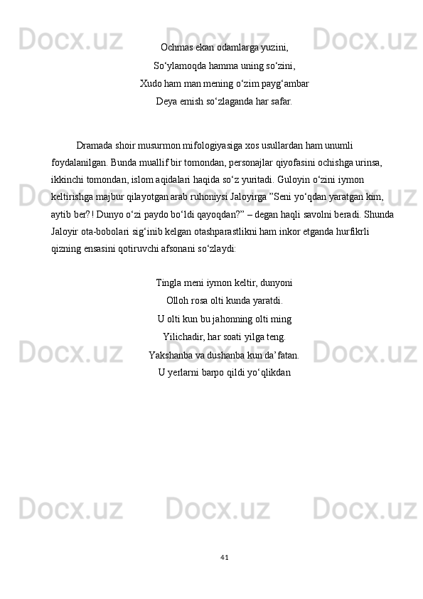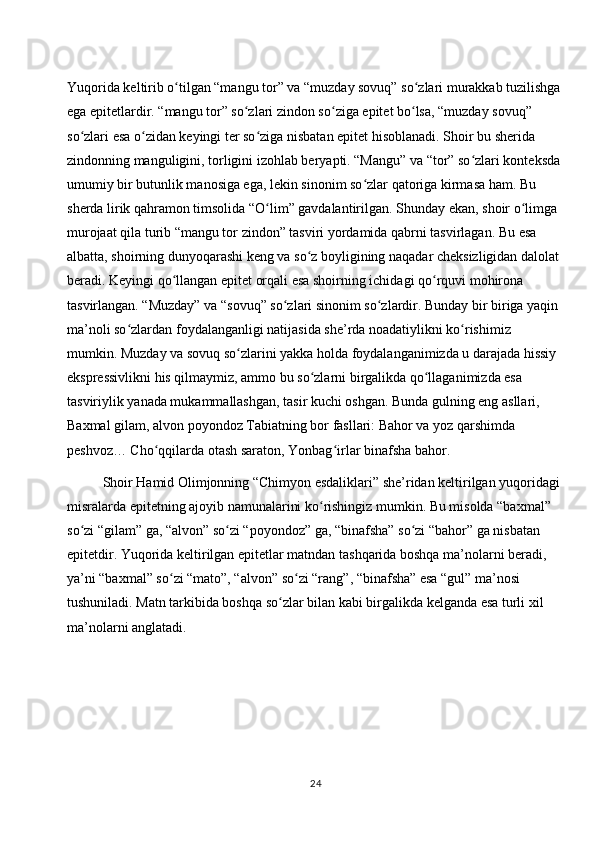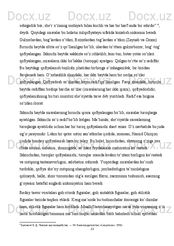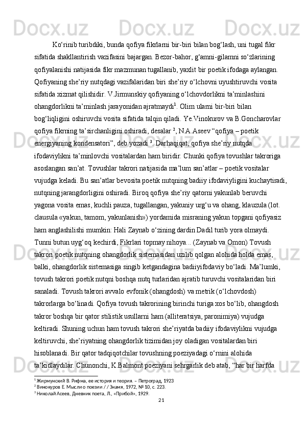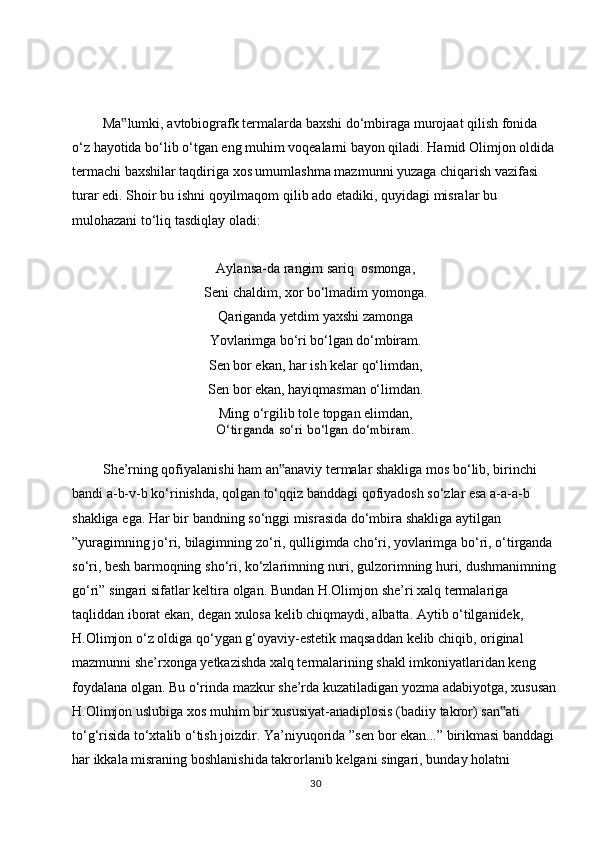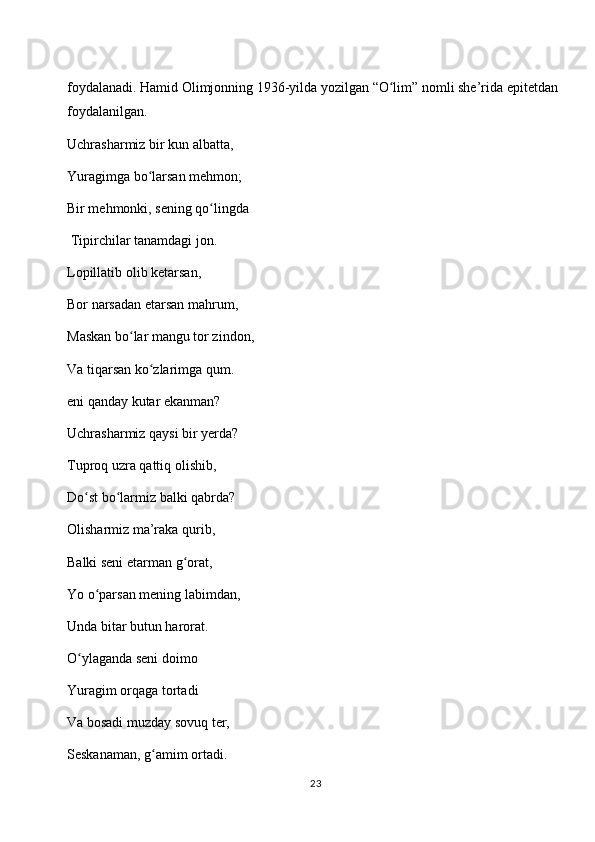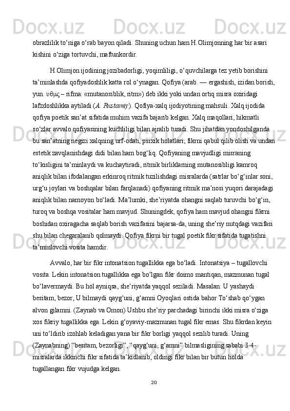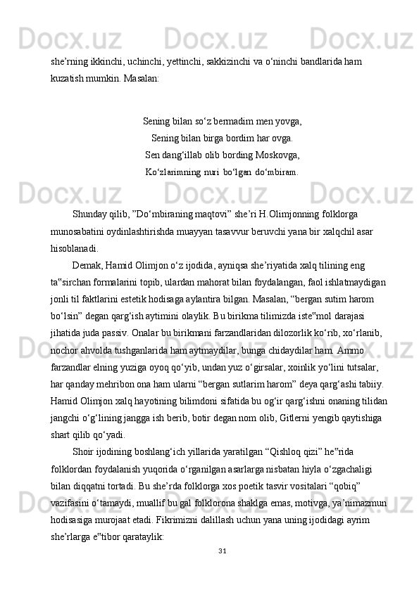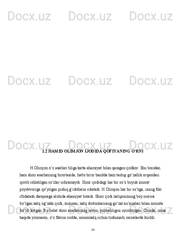 1.2 Hamid Olimjon ijodida qofiyaning o‘rni ...………………….…….….….... 21