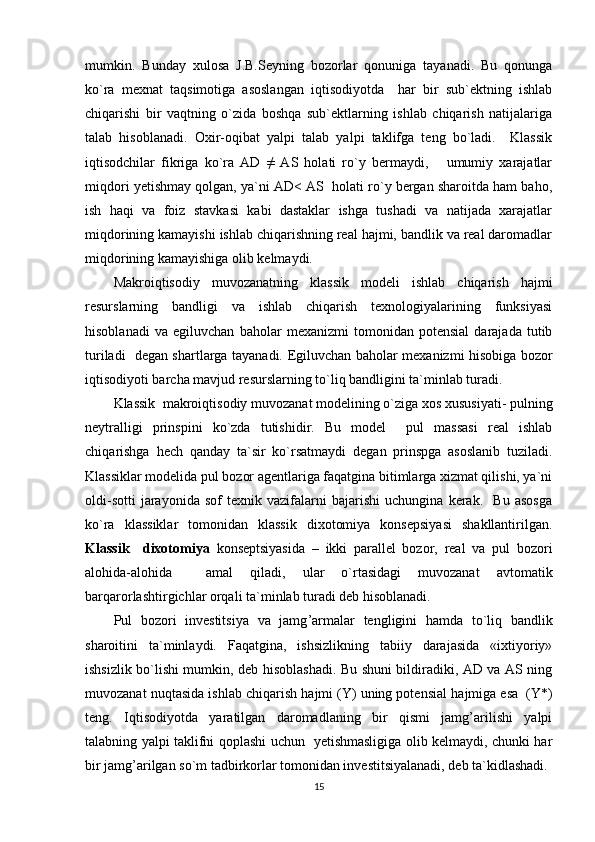 tenglashadi.   O`z   navbatida   yalpi   talab   va   taklifning   tenglashishiga   (AD   =   AS)