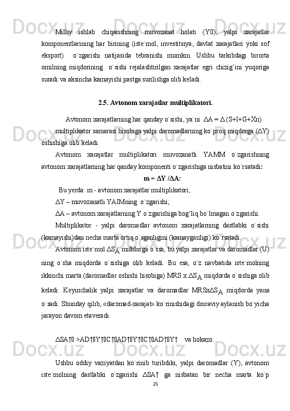 ΔA – avtonom xarajatlarning Y o`zgarishiga bog’liq bo`lmagan o`zgarishi.