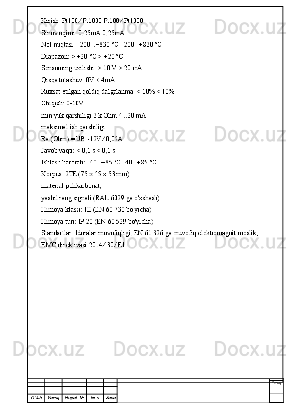 | 2.2 | HSM harorat o’zgartirgich datchigining metrologik xarakteristikalari, o‘lchash diapazoni, aniqlik sinfi va yo‘l qo‘yiladigan xatoliklarini hisoblash…………………………………………….………………… 2.3 HSM harorat o’zgartirgich datchigining o‘rnatish uchun qo‘yiladigan talablar…………………………………………………..