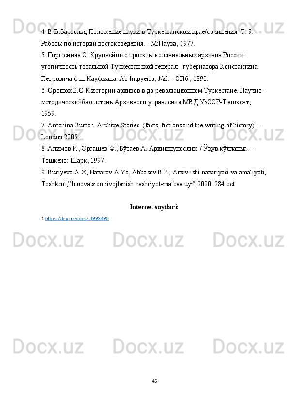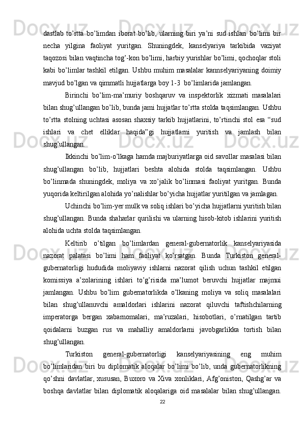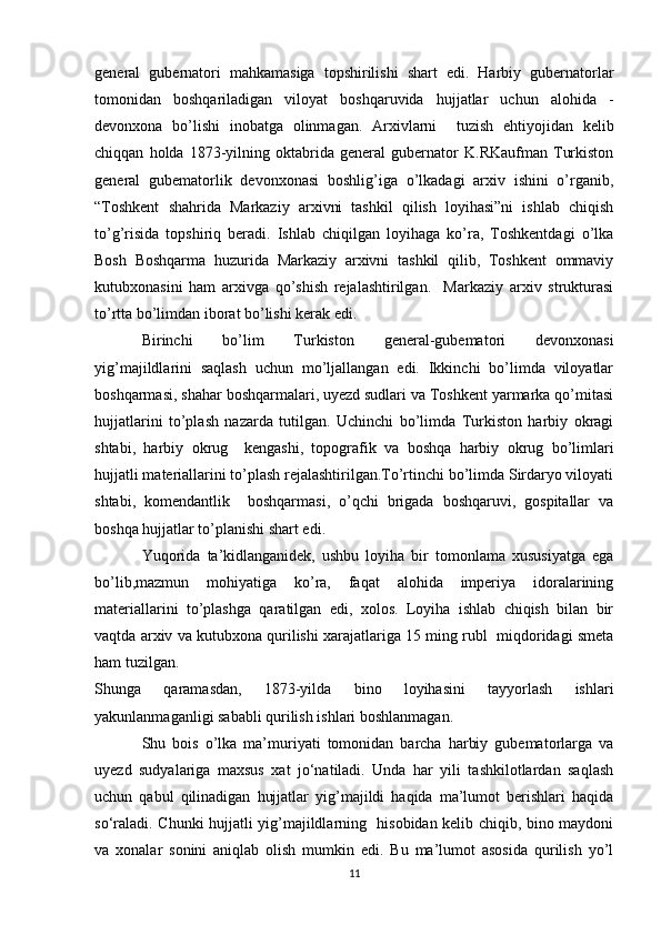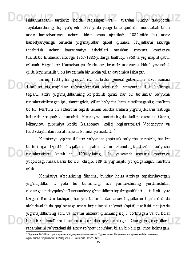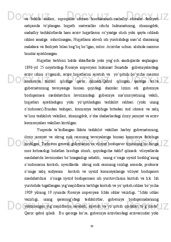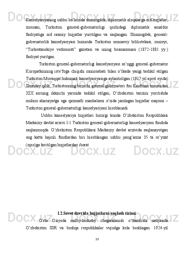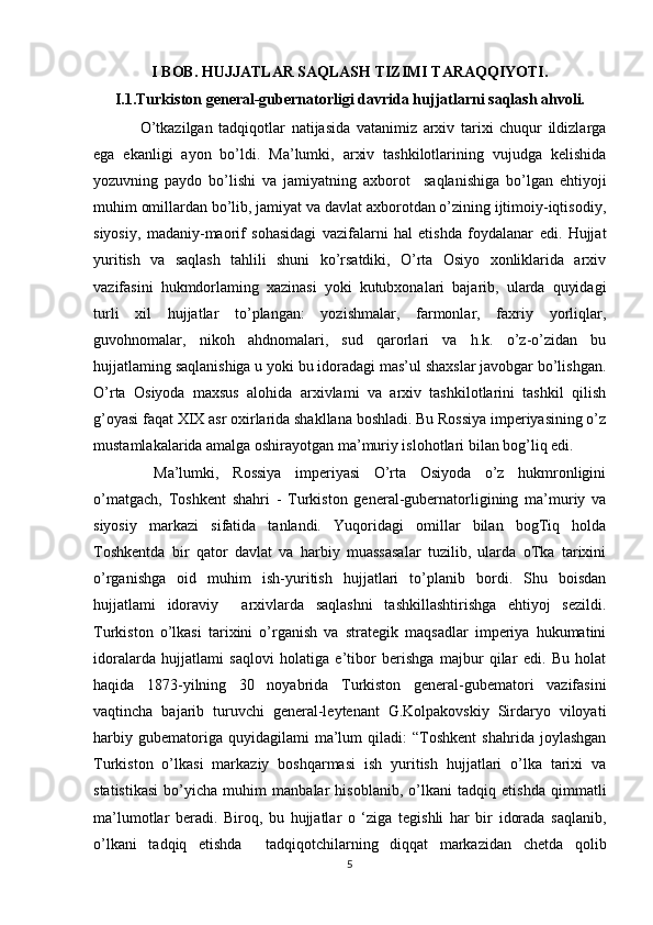 | I.1. | Turkiston general-gubernatorligi davrida hujjatlarni saqlash ahvoli . . . . . . . . . . . . . . . . . . . . . . . . . . . . . . . . . . .
