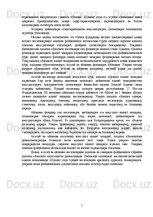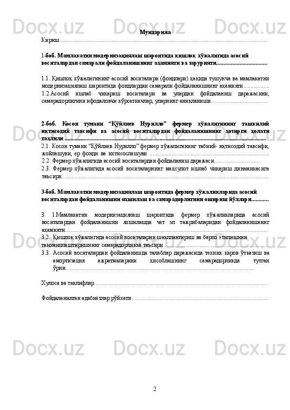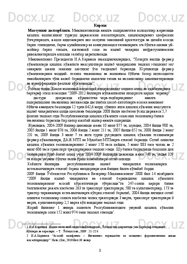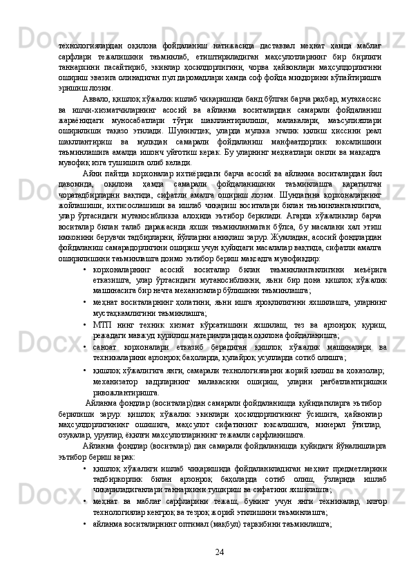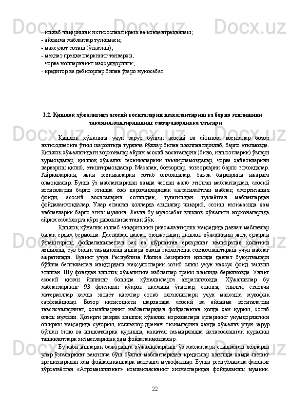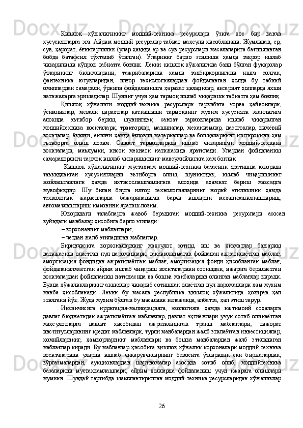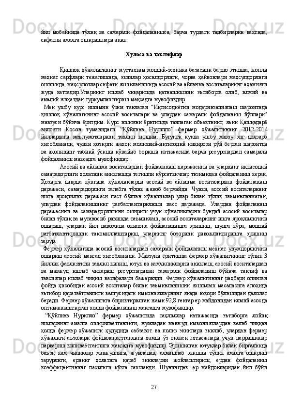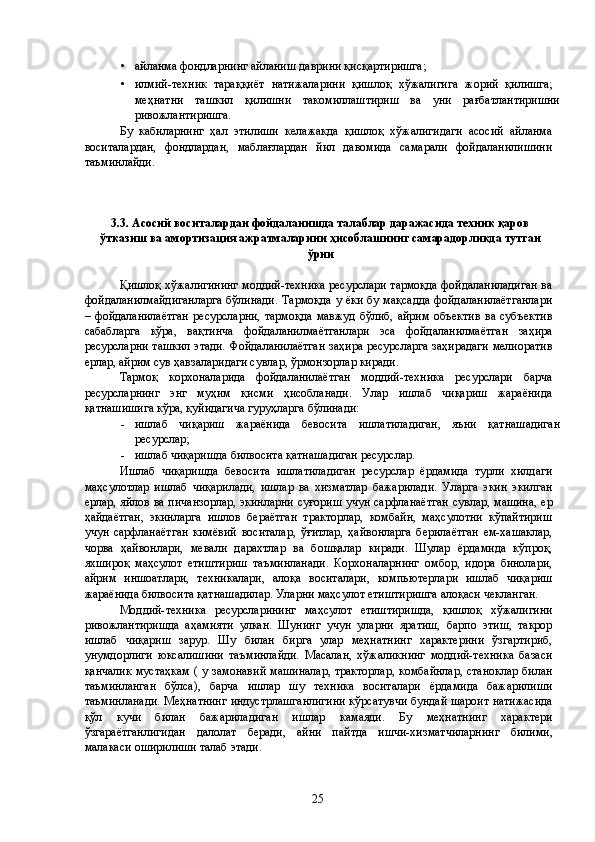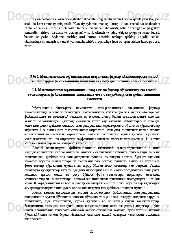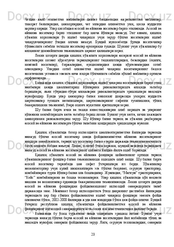 Иқтисодиётни модернизациялаш шароитида қишлоқ хўжалигининг асосий воситалари (фондлари) ва улардан самарали фойдаланиш йўллари