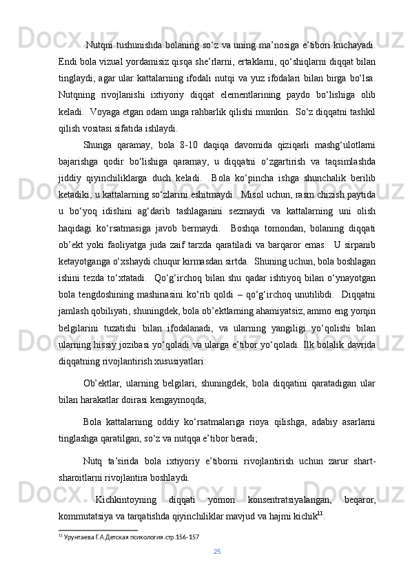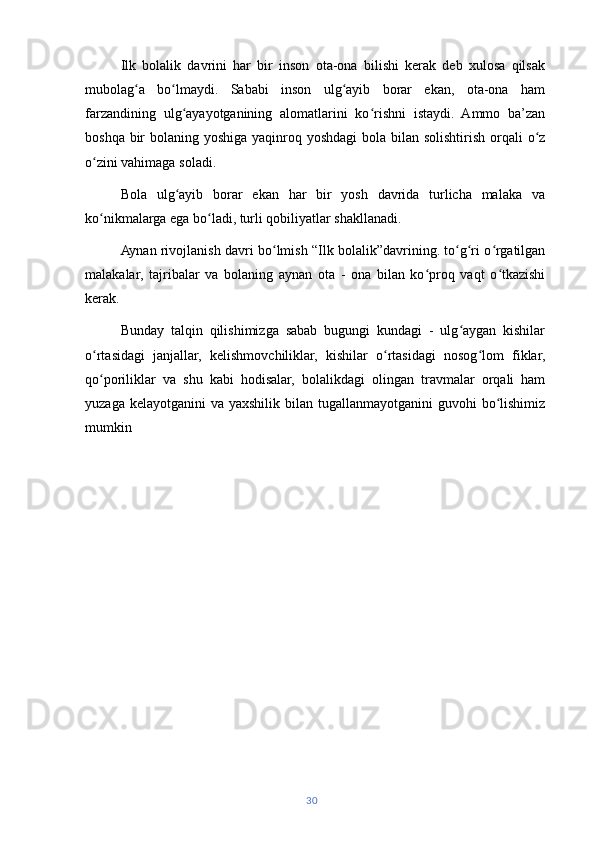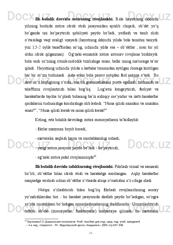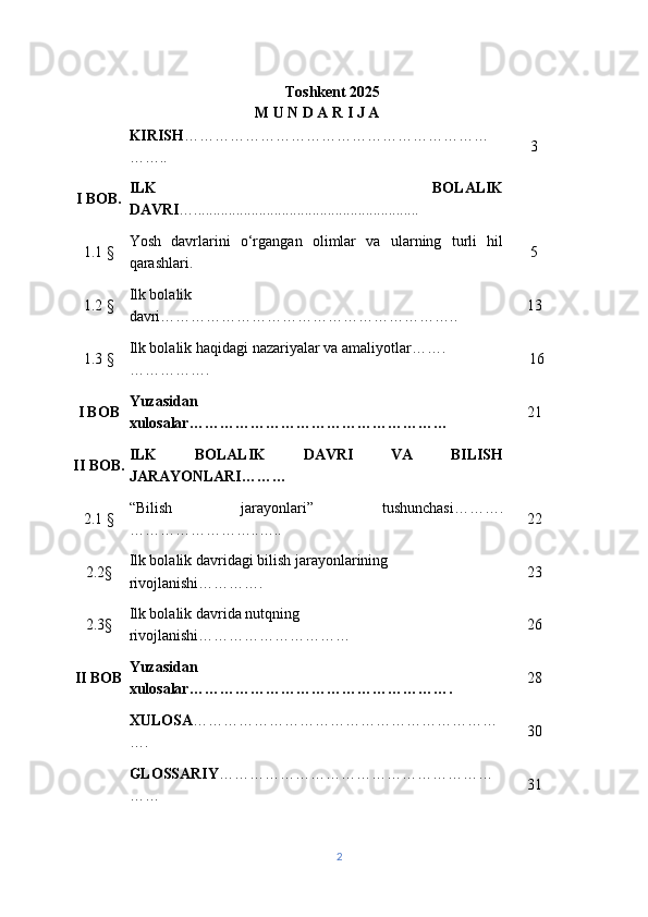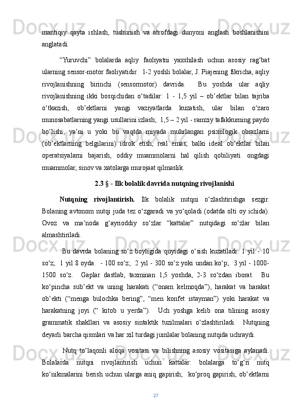 | Ilk bolalik davrida nutqning rivojlanishi………………………… | 26 | |