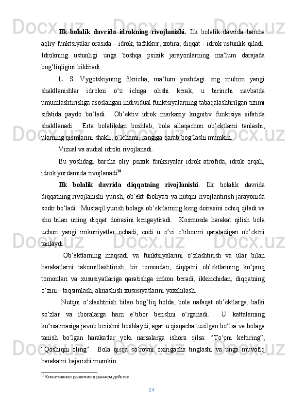 | Ilk bolalik davridagi bilish jarayonlarining rivojlanishi…………. | 23 | |