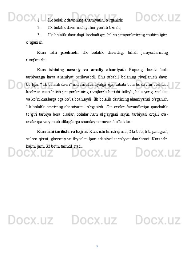 | Ilk bolalik haqidagi nazariyalar va amaliyotlar…….……………. | 16 | |