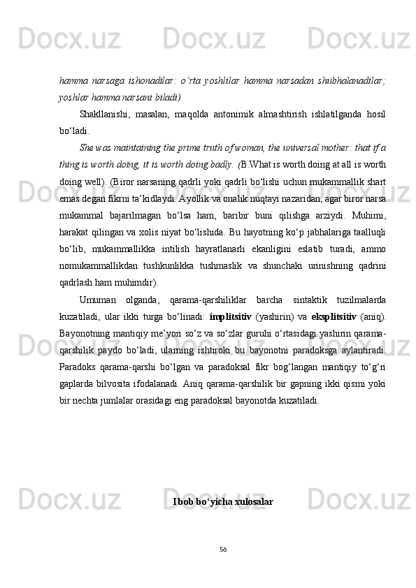 III BOB. INGLIZ VA O‘ZBEK TILLARIDA PARADOKSLARNING LINGVOMADANIY XUSUSIYATLARI.........................................................