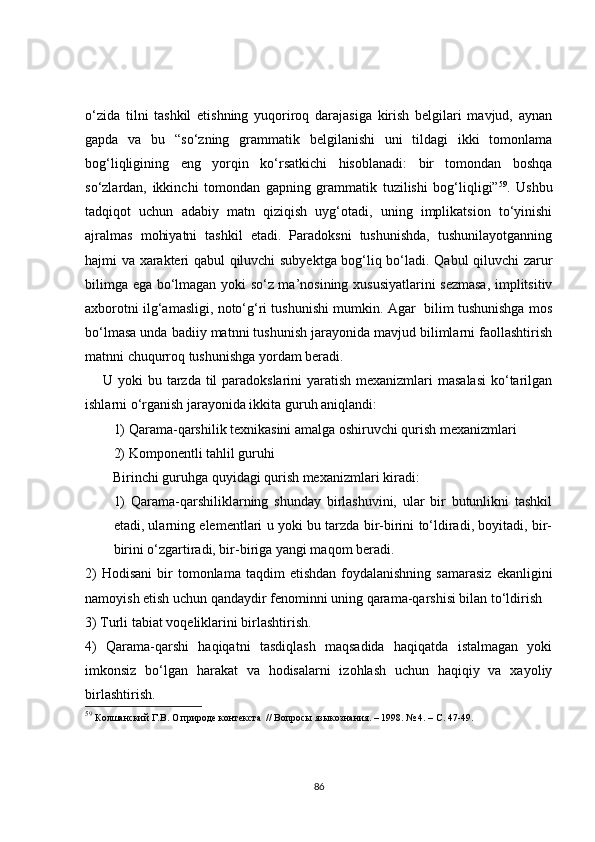 2.3.§.Paradoksning kognitiv tabiati: alogik(mantiqsiz) til birliklari va ziddiyat, prezumpsiya, presuppozitsiya va implikatsiya……….............………………..….64