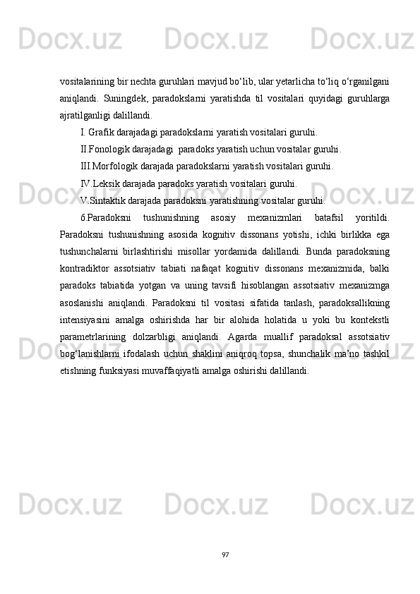 Badiiy matndagi paradokslarning lingvomadaniy xususiyatlari esa N.F.Alefirenko, V.A.Maslova, A.V.Kunin, V.N.Teliyalarning[5] ilmiy tadqiqotlarida yoritilgan.