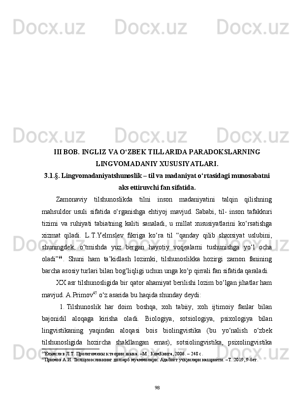 3.1.§.Lingvomadaniyatshunoslik – til va madaniyat o‘rtasidagi munosabatni aks ettiruvchi fan sifatida ……………………………………............………………..85