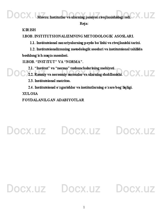 Institutlar   jamiyat   rivojlanishining   barcha   bosqichlarida   muhim   rol   o`ynab
