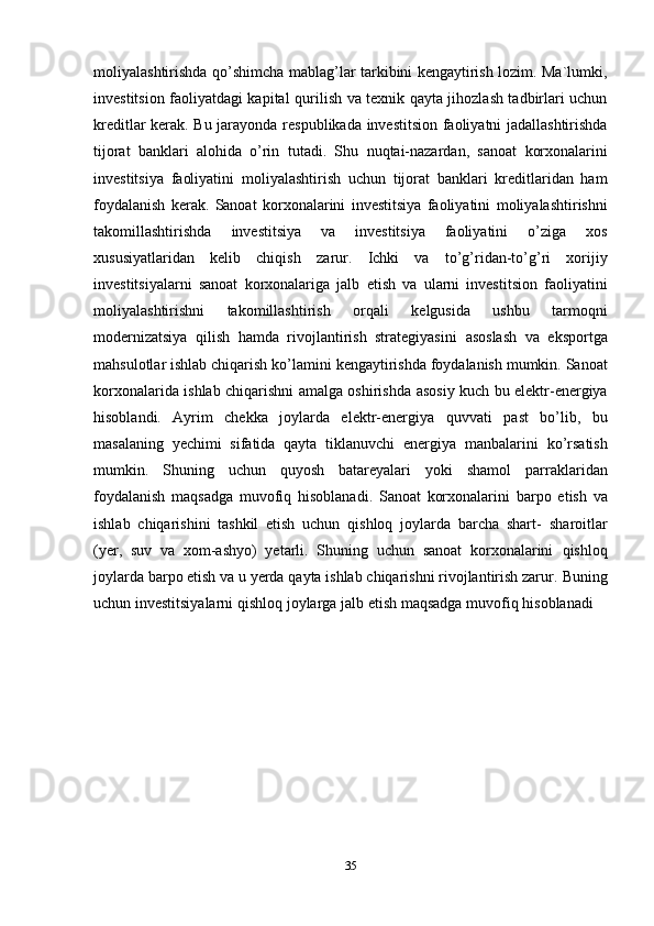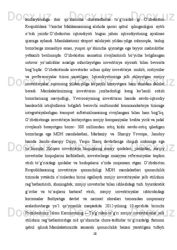 beradi.   Mamlakatimizning   investitsion   jozibadorligi   keng   ko’lamli   sotish