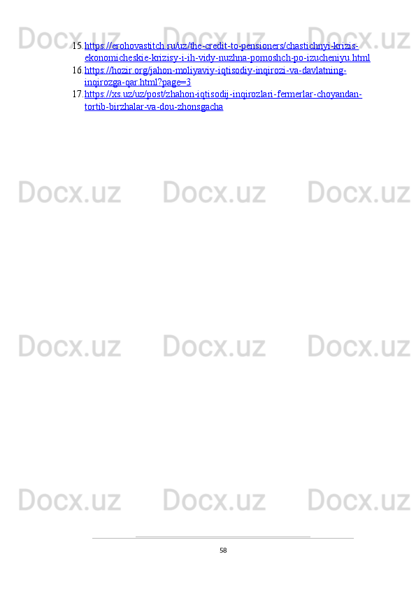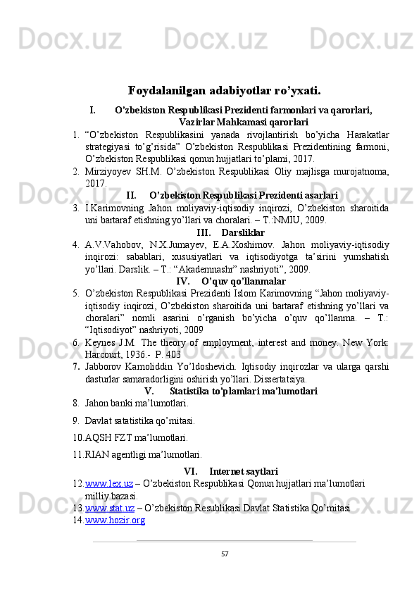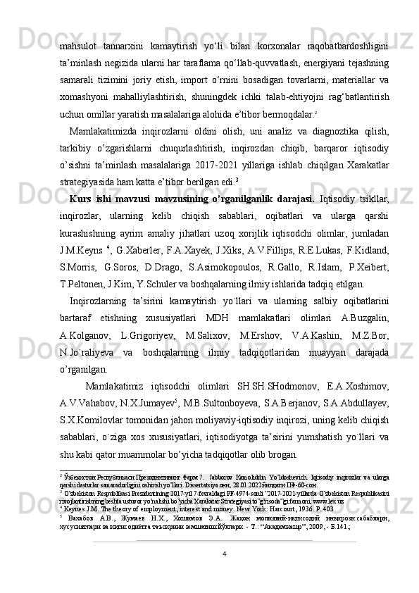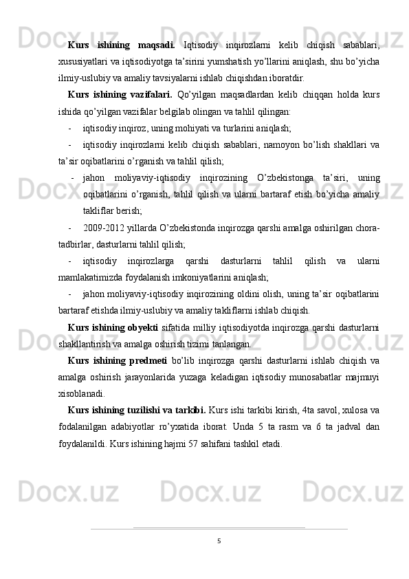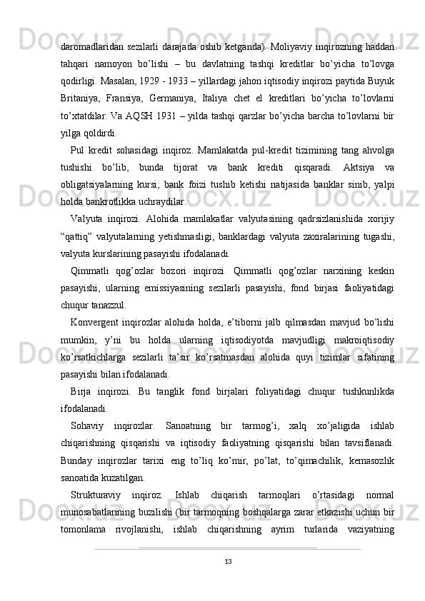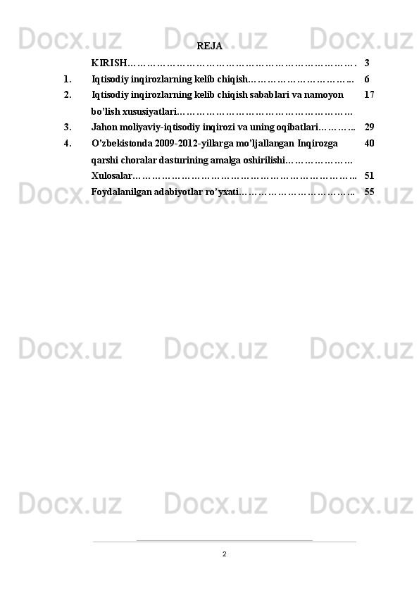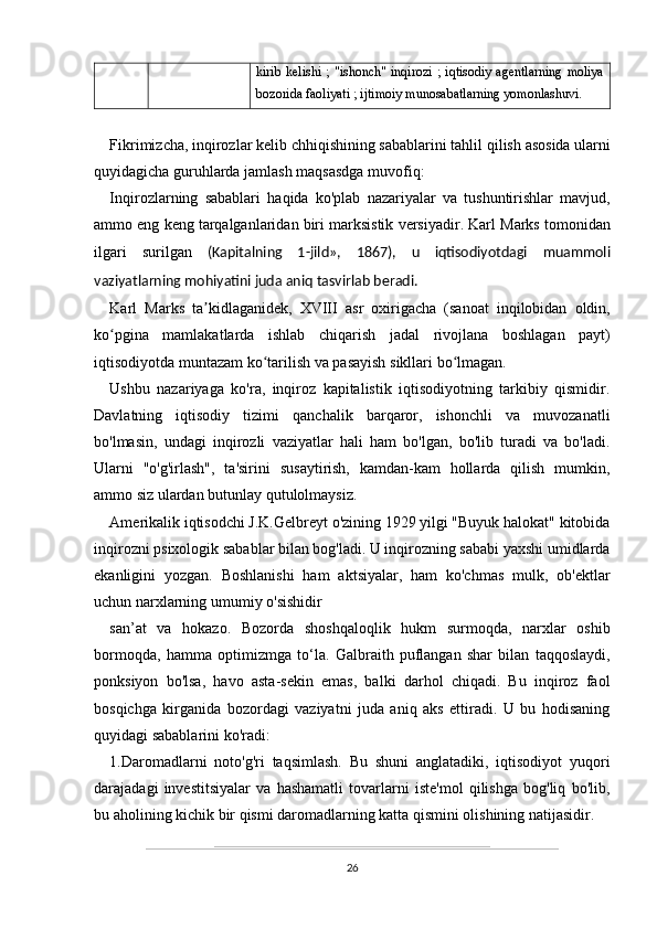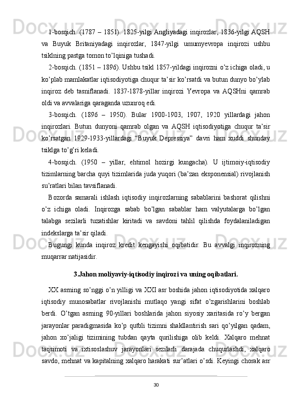 2. Iqtisodiy inqirozlarning kelib chiqish sabablari va namoyon bo’lish xususiyatlari……………………………………………… 17