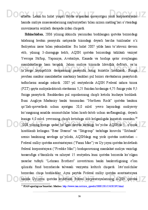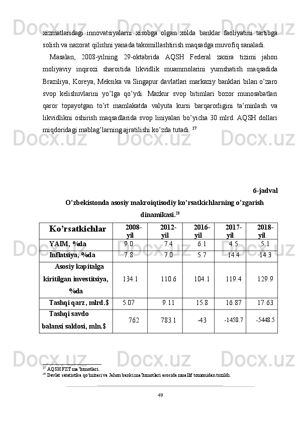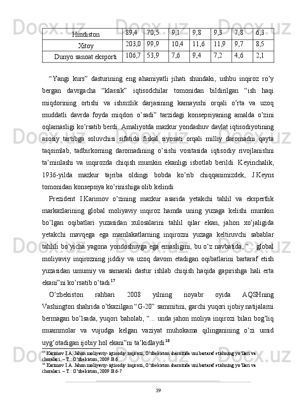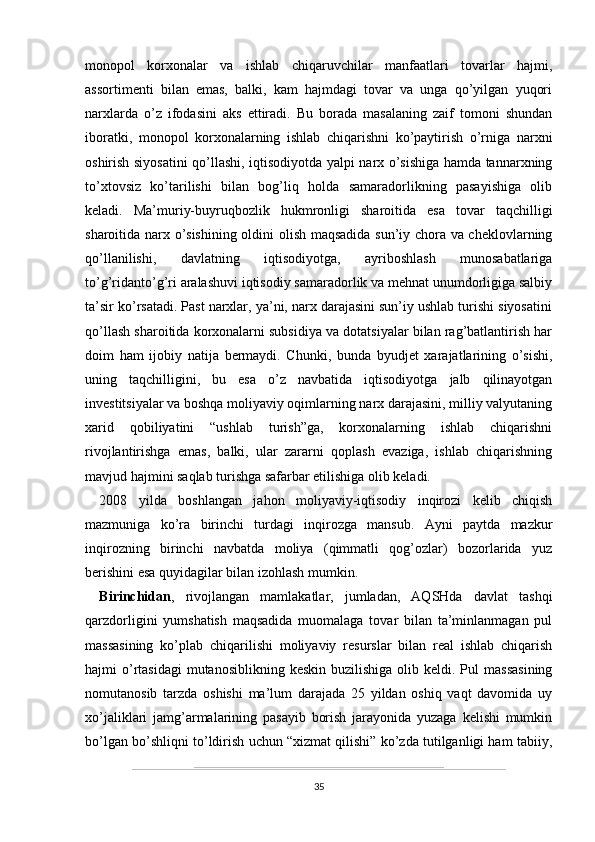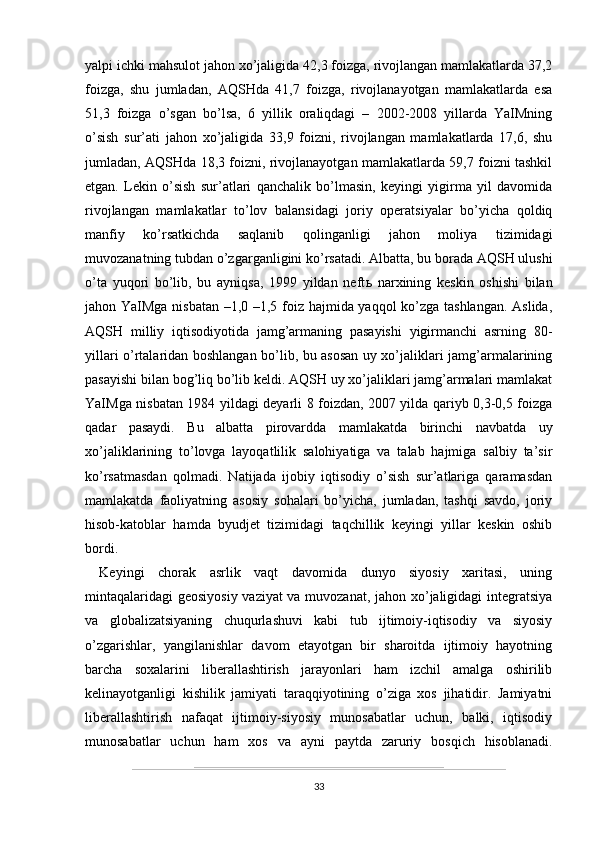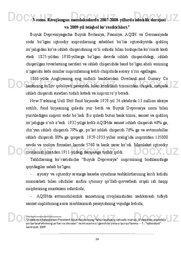 3. Jahon moliyaviy-iqtisodiy inqirozi va uning oqibatlari………... 29