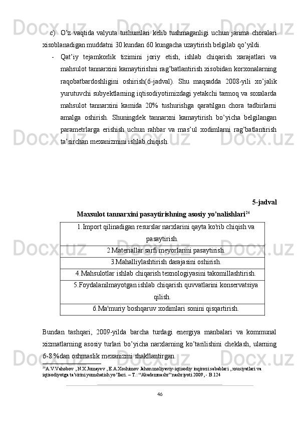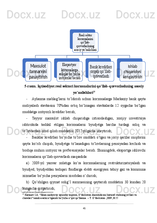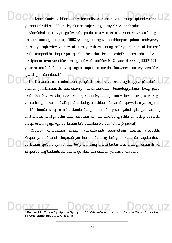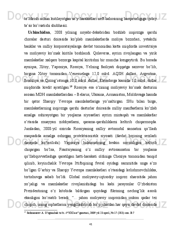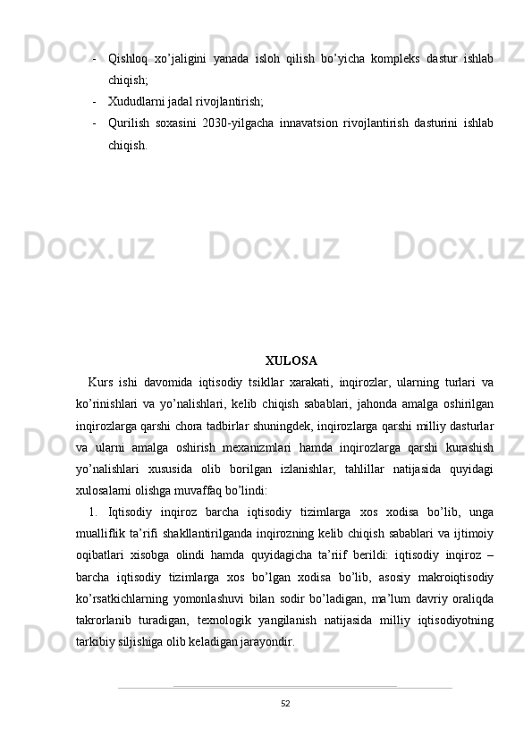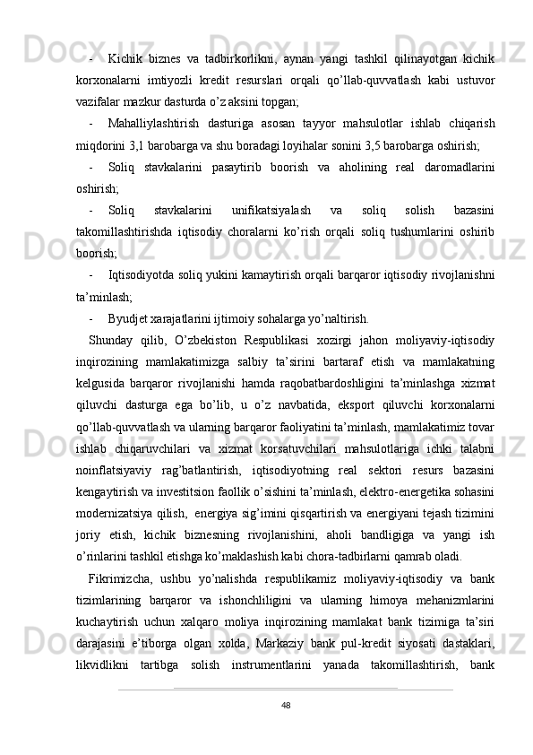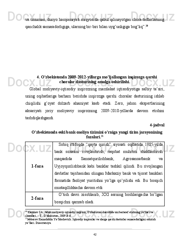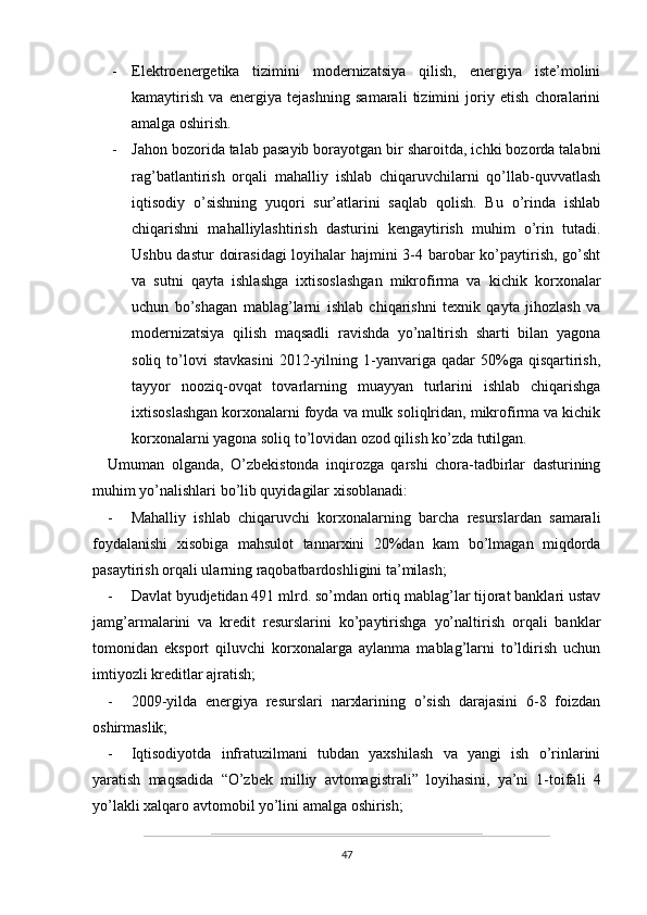 4. O’zbekistonda 2009-2012-yillarga mo’ljallangan Inqirozga qarshi choralar dasturining amalga oshirilishi………………… 40