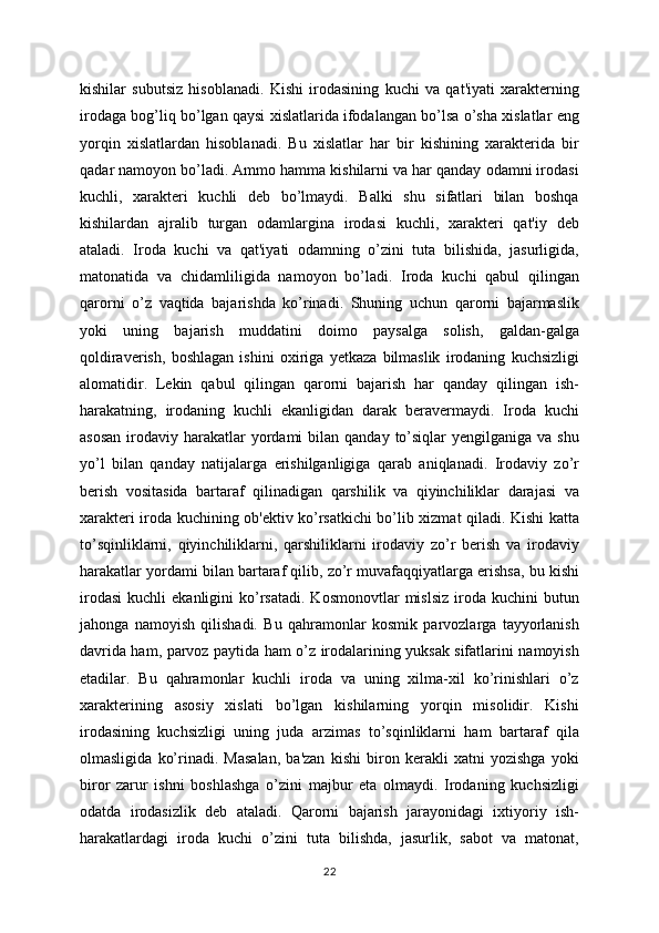 muhim   sifati   bo’lib,   iroda   kuchining   yaqqolligini   ko’rsatadi.   Sabot,   matonat   -