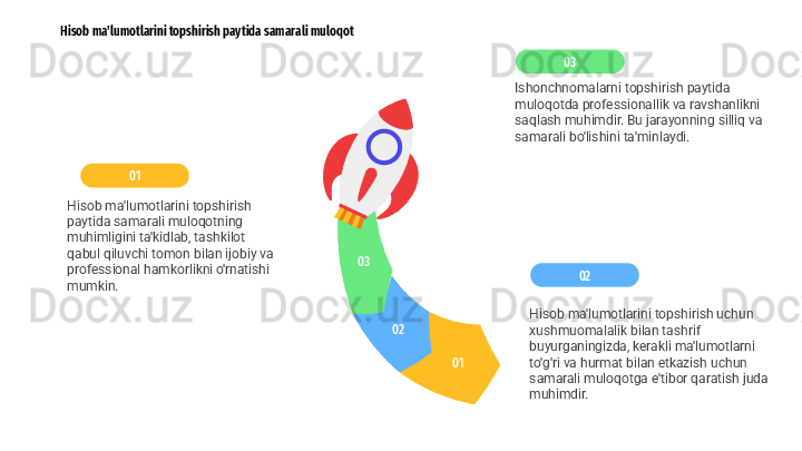 mumkin.Hisob ma'lumotlarini topshirish paytida samarali muloqot Ishonch yorliqlarini topshirish va xushmuomalalik bilan